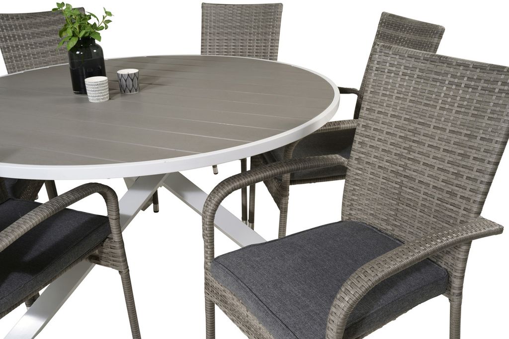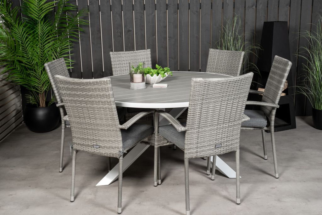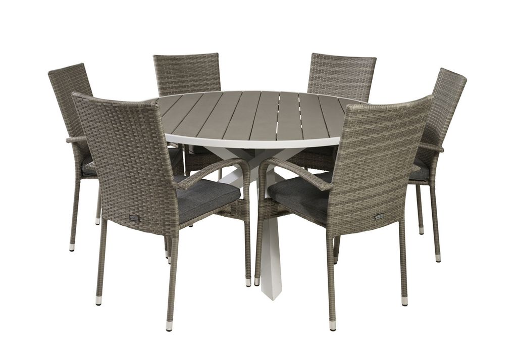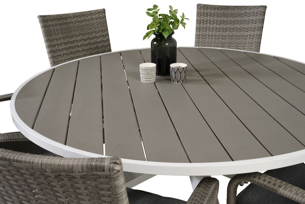 Rund matgrupp bestående av matbord Parma och amtstolar Anna. Här får du en matgrupp i konstrotting, som passar in i de flesta miljöer.