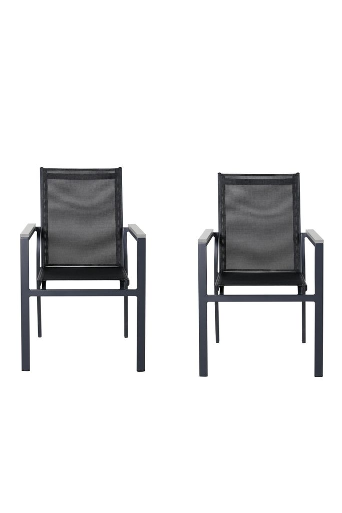 Venture Home Parma Matstol 2-pack erbjuder en klassisk och industriell design med raka nordiska former. Den svartfärgade stolen skapar en lyxig känsla och är tillverkad i slitstarkt aluminium och textilene. Armstöden är gjorda i grå aintwood, vilket tillför en smakfull detalj.