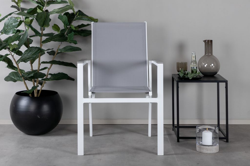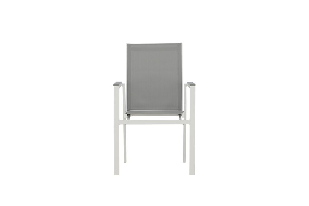 Parma karmstol i industriell design, med aluminium och textilene för hållbarhet. Stapelbar och modern i grått och vitt.