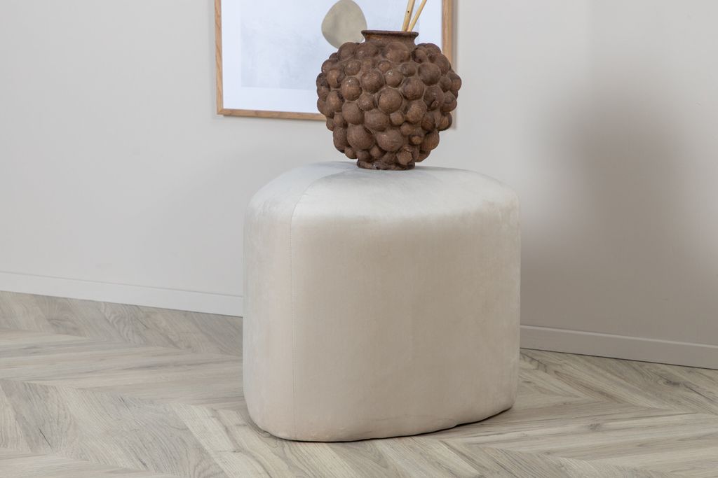Den triangelformade sittpuffen Peg skapar snabbt en stilmedveten atmosfär och blir garanterat ett smart tillskott i ditt hem! Med sina mjuka former och sammetslena yttre i mysig beige kulör får sittpuffen ett elegant lyster som blir en iögonfallande detalj. Använd som fotpall att vila fötterna på, som extra sittplats när gästerna blir många eller placera som en stilikon intill övrigt möblemang - bara fantasin sätter gränser! Tillverkad i materialen skum, bomullsfiber, sammetstyg och böjt trä. Puffens mått: Höjd: 41 cm, diameter: 46 cm.