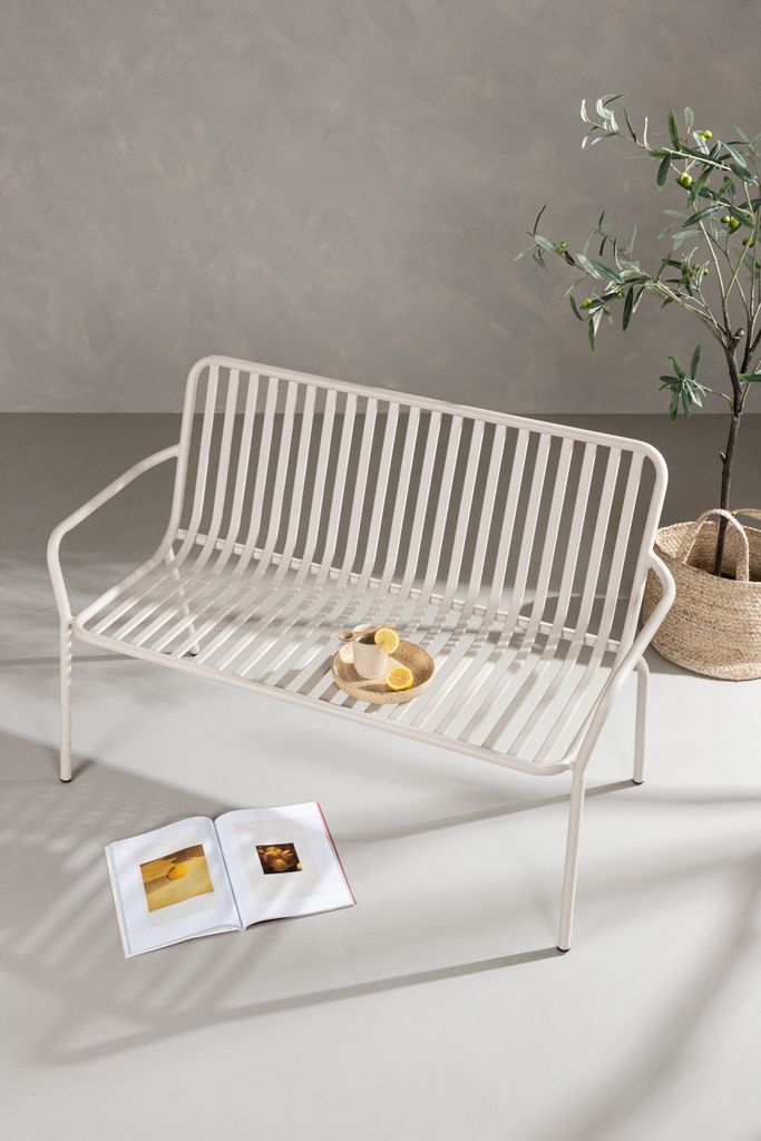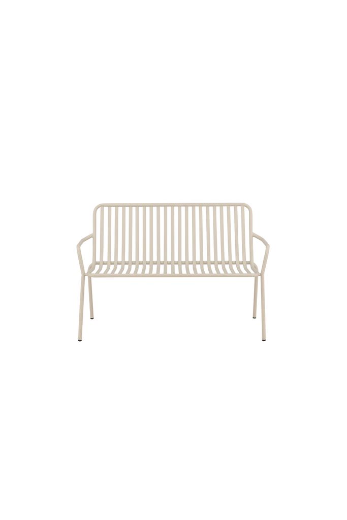 Elegant bänksoffa i beige aluminium som kombinerar stil och funktion. Perfekt för flexibel och sofistikerad inredning.