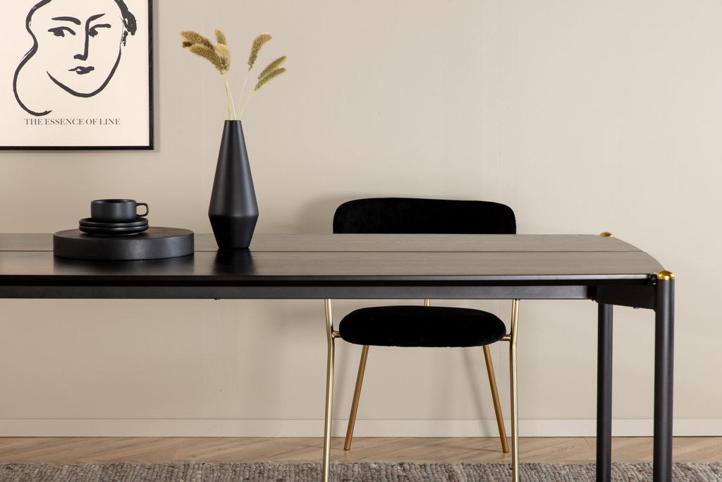 Elegant och tidlöst matbord med nordisk design, svart MDF-faner och mässingsdetaljer.