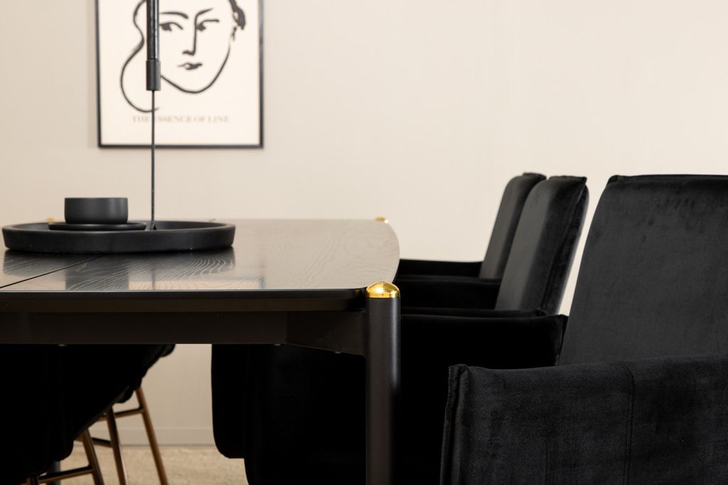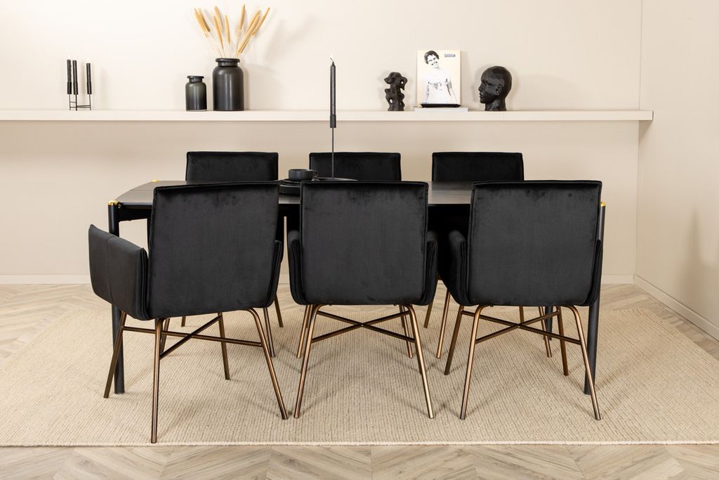 Skapa ett blickfång som imponerar! Matstolarna Petra har en läcker design med raka nordiska former, mjukt sammetstyg i svart kulör och stolsben i järn. Stolens mått: Höjd: 87cm, Sitthöjd: 48cm, Bredd: 57cm, Djup: 60cm. Här kombineras de 6st stolarna med matbord Pelle. Bordsskivan är i svart MDF med faner och bordets mått: Längd: 190cm, Bredd: 90cm, Höjd: 75cm. Designen är genomtänkt med raka nordiska former som ger en stilren känsla, smala ben i järn som har en dekorativ mässingknopp på toppen och en springa i bordsskivans mitt som blir en läcker detalj.