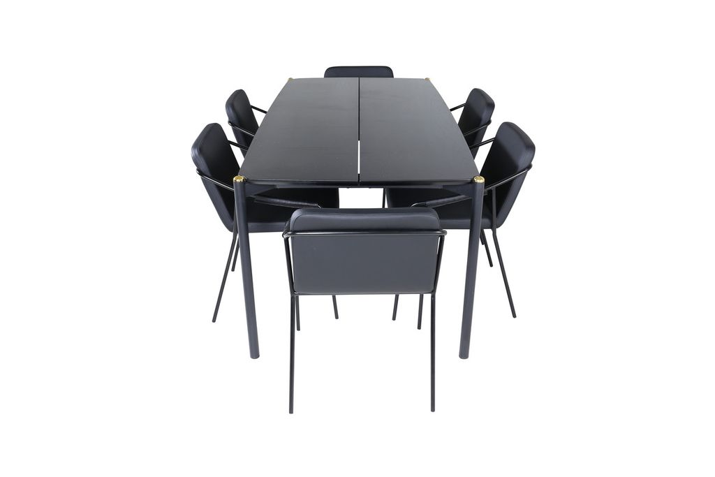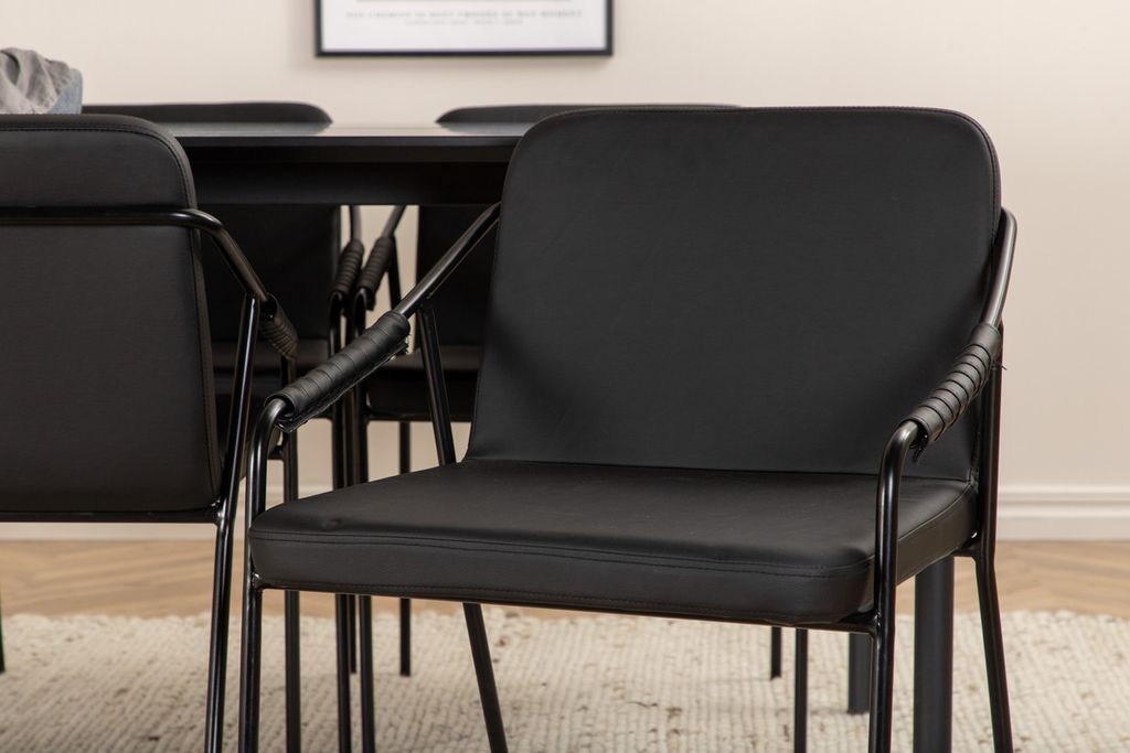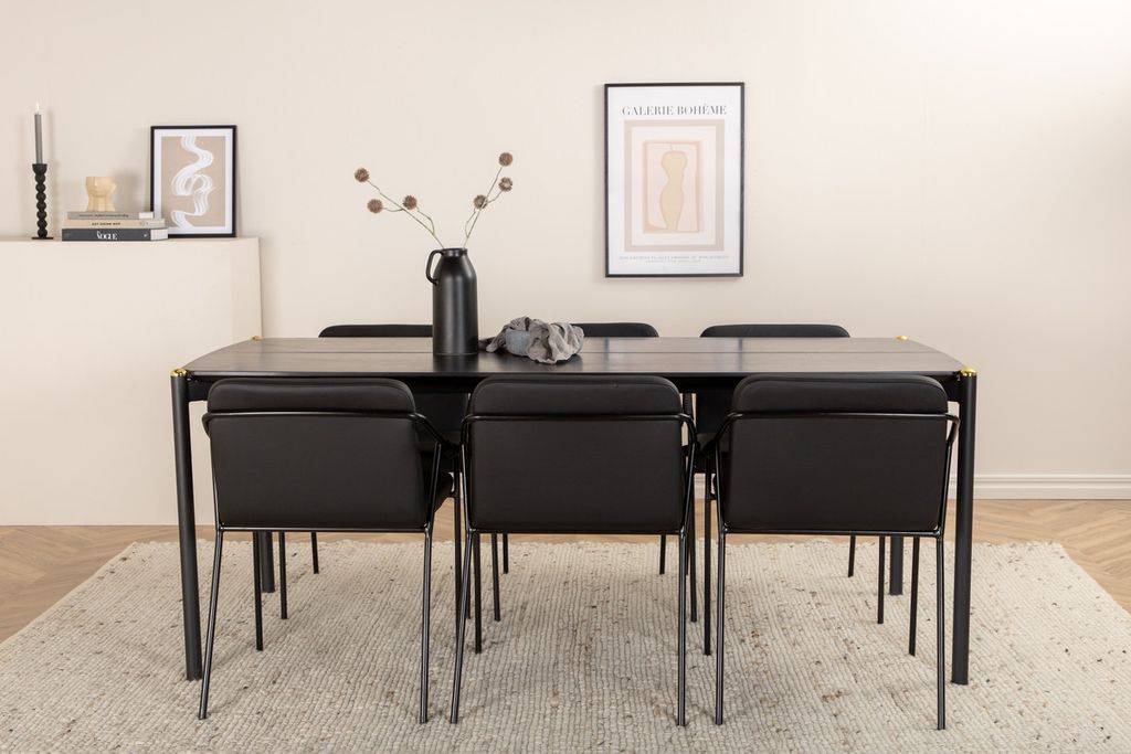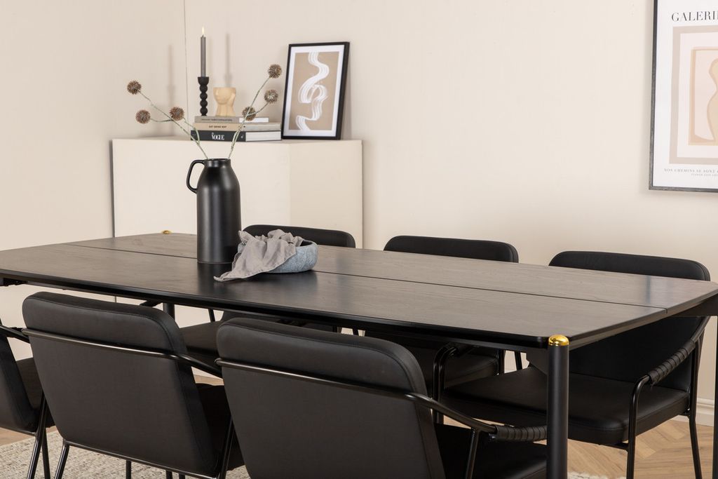Inbjudande, stilsäkert och tidlöst – Matbord Pelle skapar ett modemedvetet intryck i ditt hem! Designen är genomtänkt med raka nordiska former som ger en stilren känsla, smala ben i järn som har en dekorativ mässingknopp på toppen och en springa i bordsskivans mitt som blir en läcker detalj. Bordsskivan är i svart MDF med faner och bordets mått: Längd: 190cm, Bredd: 90cm, Höjd: 75cm. Matchas här med 6st Tvist matstolar i smäcker design. Sitsarna är i svart konstläder och har integrerade armstöd samt stolsben i svart järn. Stolens mått: Höjd: 77cm, Sitthöjd: 48cm, Bredd: 53cm, Djup: 59cm.
