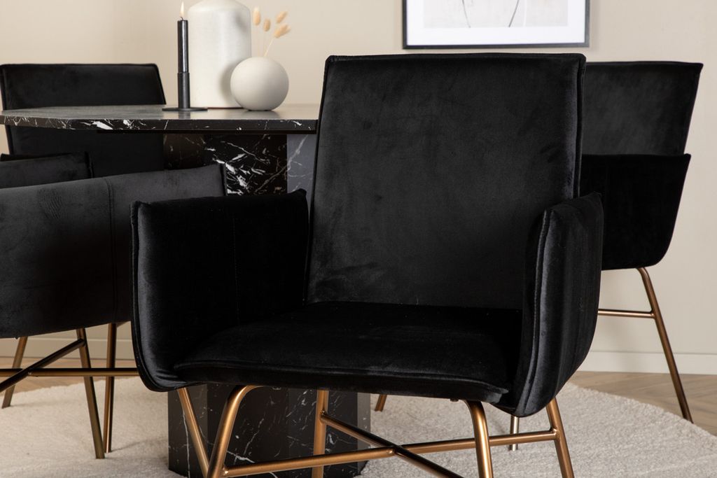 Skapa ett blickfång som imponerar! Matstolarna Petra har en läcker design med raka nordiska former, mjukt sammetstyg i svart kulör och stolsben i kopparfärgat järn. Stolens mått: Höjd: 87cm, Sitthöjd: 48cm, Bredd: 57cm, Djup: 60cm. Här kombineras de 4st stolarna med matbord Marbs - ett designbord med läcker utformning. Bordet är format som en oktagon och har en helklädd design med en toppskiva i svart marmorglas med spräckligt vitt mönster och bordsben i MDF och marmorpapper. Bordets mått: Diameter: 110cm, Höjd: 75cm.
