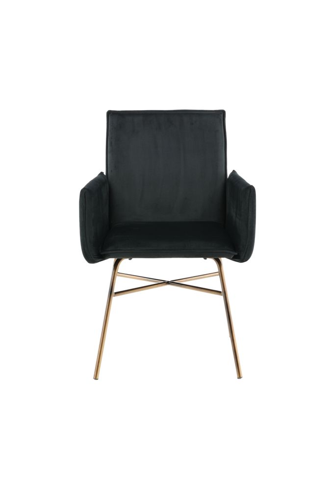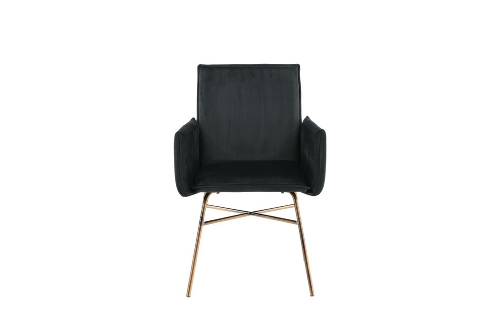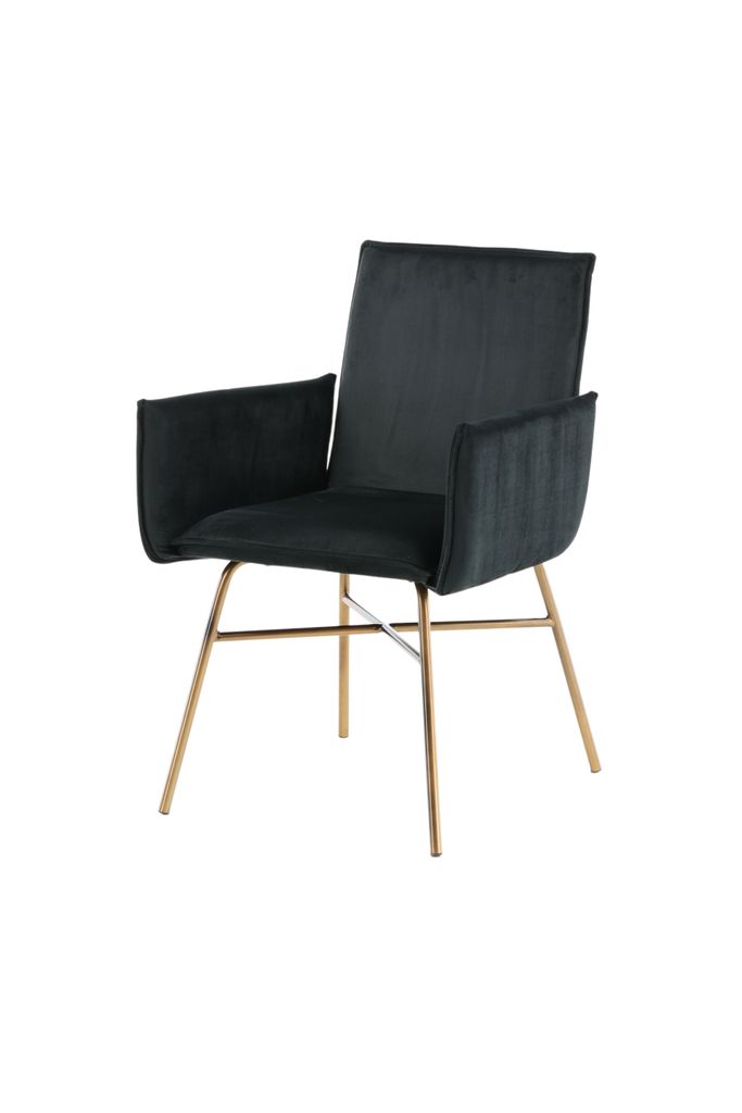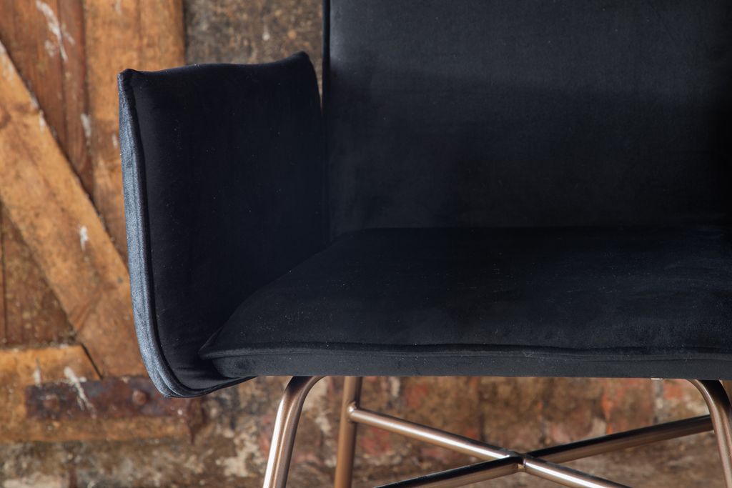 Petra – stilren matstol i svart sammet och kopparfärgat järn, erbjuder modern komfort och skandinavisk design.