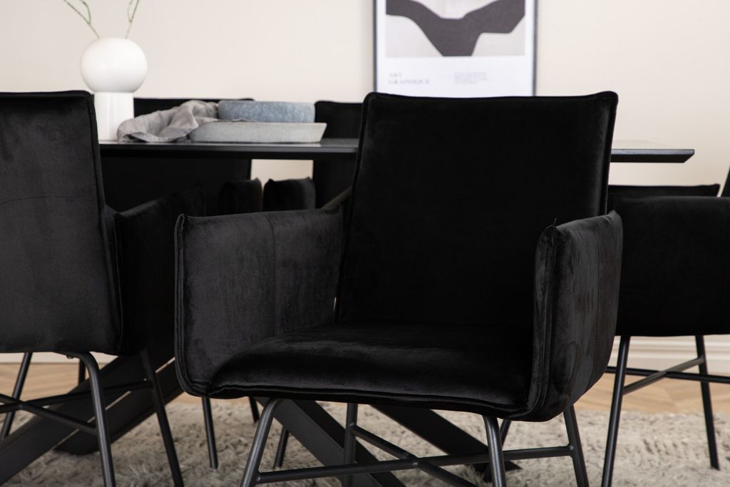 Stilrent, bekvämt och elegant - vad mer kan man önska? Piazza är vårt omtyckta rektangulära matbord med lyxig känsla och trendiga detaljer i designen. Bordsskivan är tillverkad av MDF faner i smäcker svart kulör och stommen skapar ett stadigt blickfång med kryssben i svart järn. Här tillsammans med våra läckra matstolar Petra. Stolarna har ett bekvämt sittdjup, stolsbenen är stilrent smala i järn och sitsen är i svart sammetstyg som ger ett fint lyster till rummet. Njut av trivsamma måltider framöver!