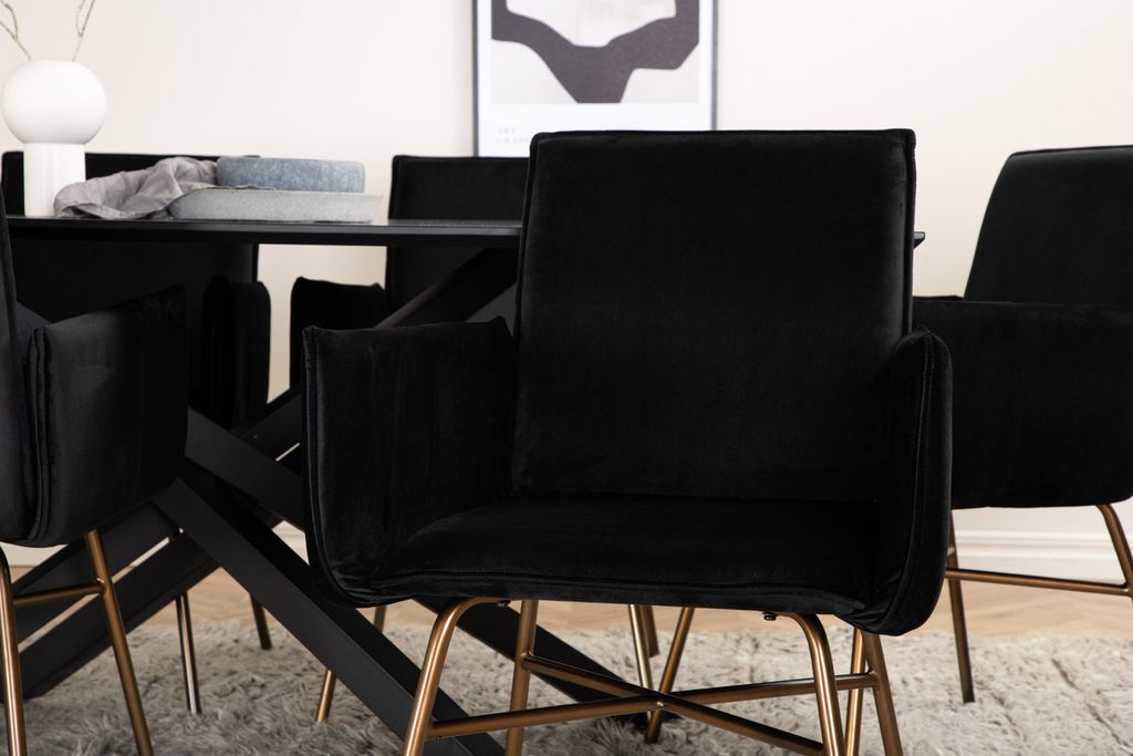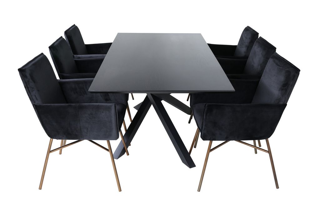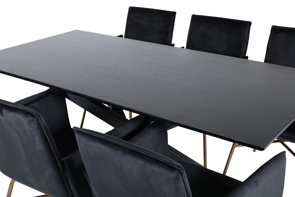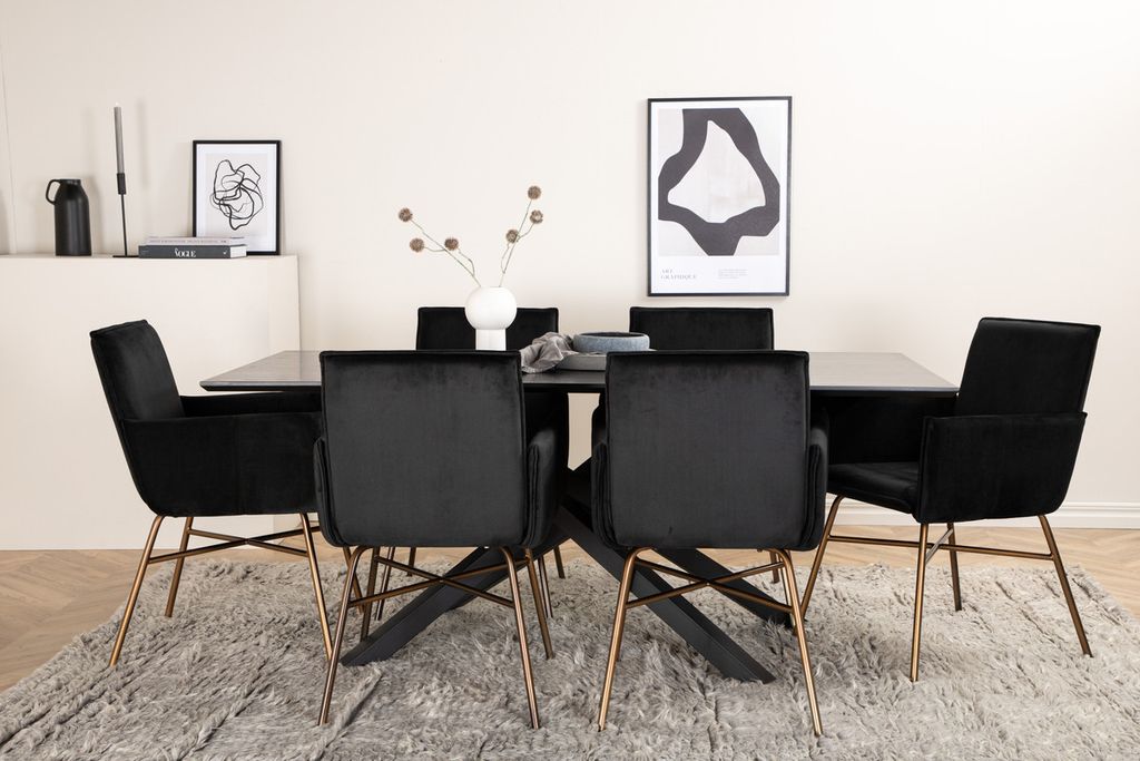 Stilrent, bekvämt och elegant - vad mer kan man önska? Piazza är vårt omtyckta rektangulära matbord med lyxig känsla och trendiga detaljer i designen. Bordsskivan är tillverkad av MDF faner i smäcker svart kulör och stommen skapar ett stadigt blickfång med kryssben i svart järn. Här tillsammans med våra läckra matstolar Petra. Stolarna har ett bekvämt sittdjup, stolsbenen är stilrent smala i kopparfärgat järn och sitsen är i svart sammetstyg som ger ett fint lyster till rummet. Njut av trivsamma måltider framöver!