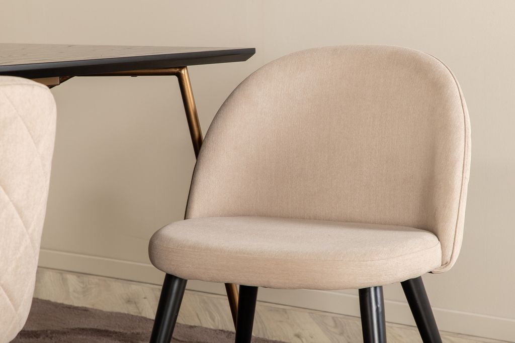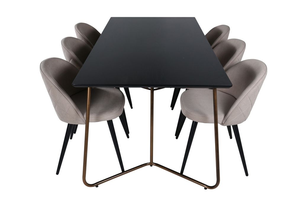 Vad mer kan man önska än en matgrupp som både är bekväm, stilren och inger en lyxig känsla till rummet? Det är precis vad den här moderna kombinationen erbjuder! Matbord Petra har en genomtänkt design med skandinaviska former som ger en stilren känsla, smala, lätt utsvängda ben i järn och en bordsskiva i svart MDF med faner. Bordets mått: Längd: 190cm, Bredd: 90cm, Höjd: 75cm. Här tillsammans med 6st Velvet matstolar i mjuk design med stolsben i svart metall och beige sitsar i polyester linne. Stolens mått: Höjd: 76,5cm, Sitthöjd: 46,5cm, Bredd: 50cm, Djup: 57cm.