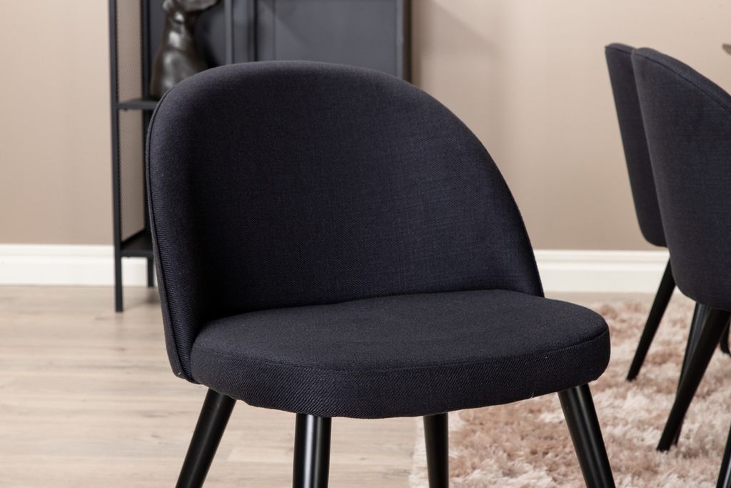 Vad mer kan man önska än en matgrupp som både är bekväm, stilren och inger en lyxig känsla till rummet? Det är precis vad den här moderna kombinationen erbjuder! Matbord Petra har en genomtänkt design med skandinaviska former som ger en stilren känsla, smala, lätt utsvängda ben i järn och en bordsskiva i svart MDF med faner. Bordets mått: Längd: 190cm, Bredd: 90cm, Höjd: 75cm. Här tillsammans med 6st Velvet matstolar i mjuk design med stolsben i metall och svarta sitsar i polyester. Stolens mått: Höjd: 76,5cm, Sitthöjd: 46,5cm, Bredd: 50cm, Djup: 57cm.