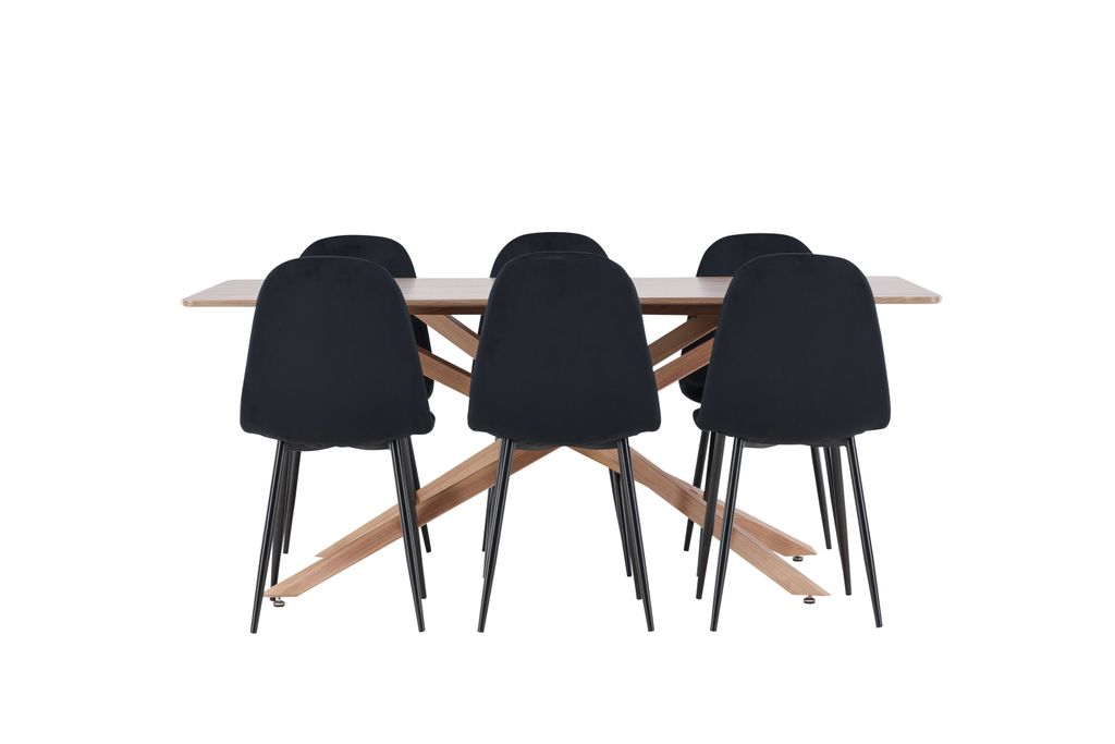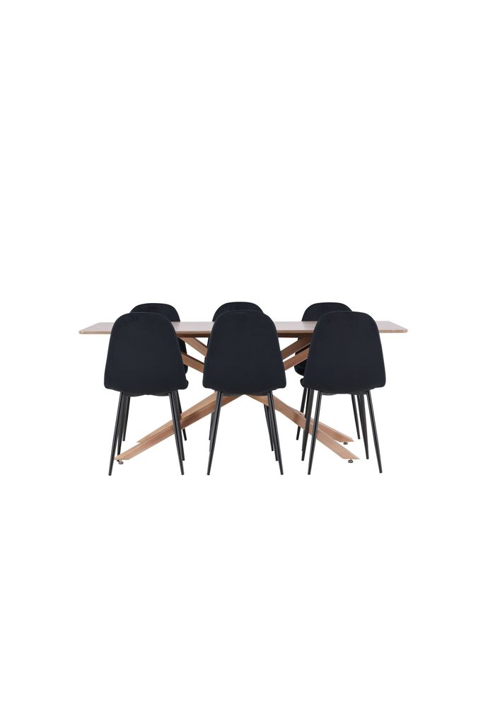 Komplett matgrupp med elegant moccafärgat bord och stilrena, svarta sammetsstolar.