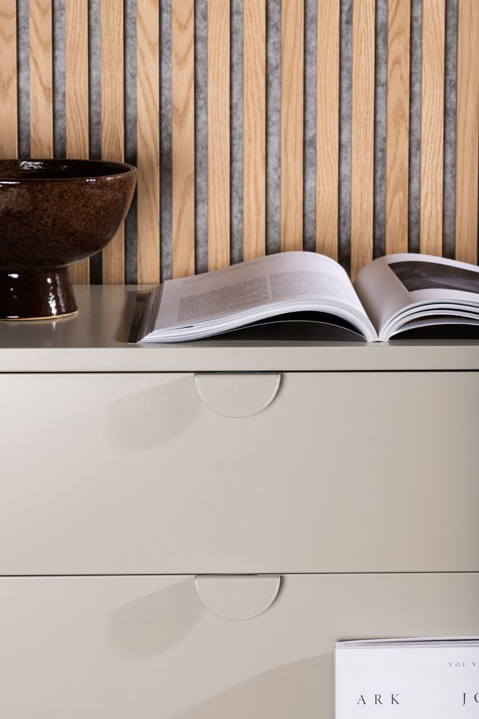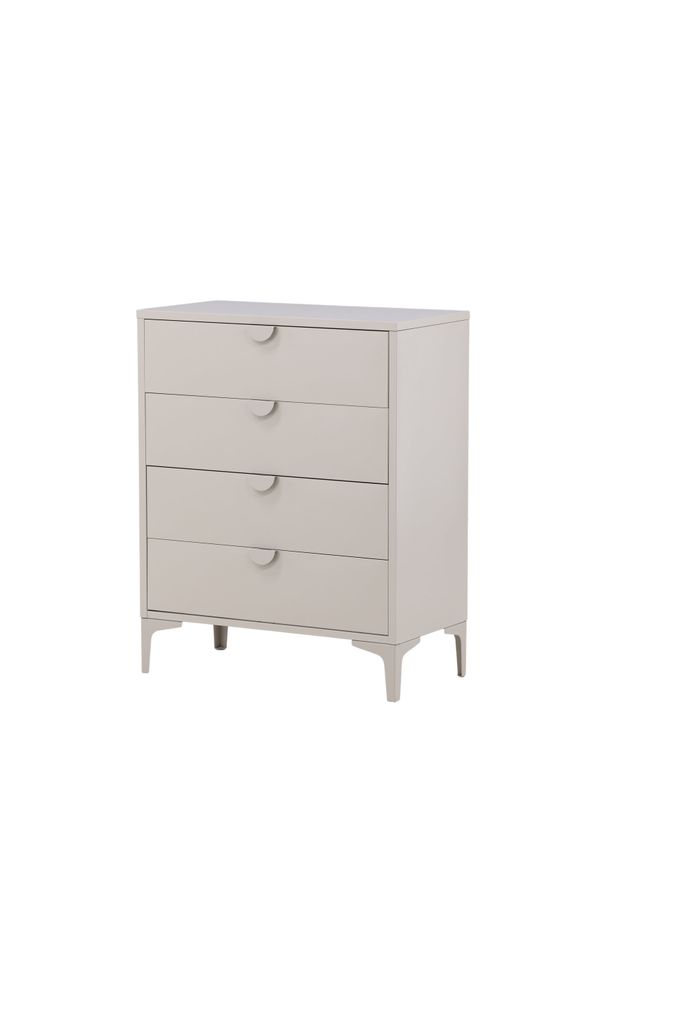 Elegant byrå i beige stål med fyra lådor för praktisk och stilren förvaring i hemmet.