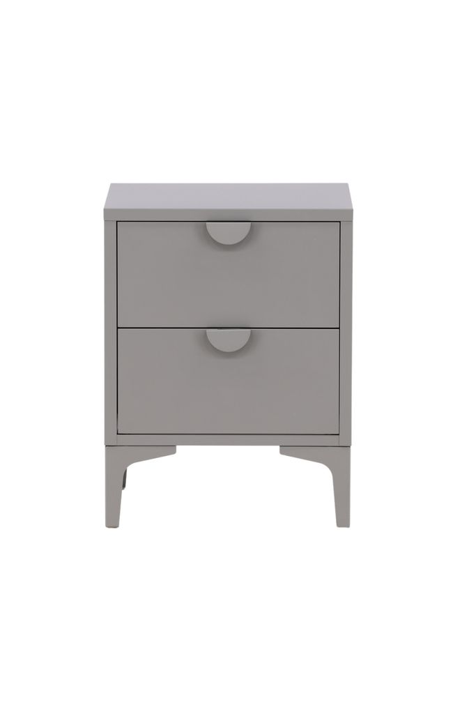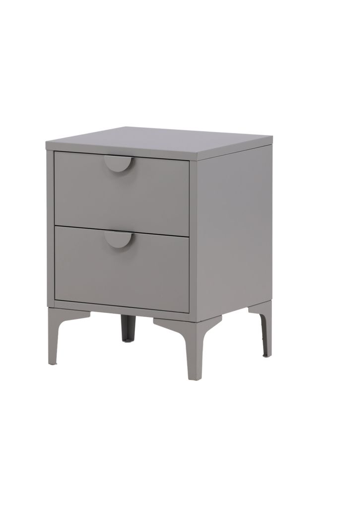 Stilrent sängbord i grått stål med två dolda lådor, perfekt för modern inredning.