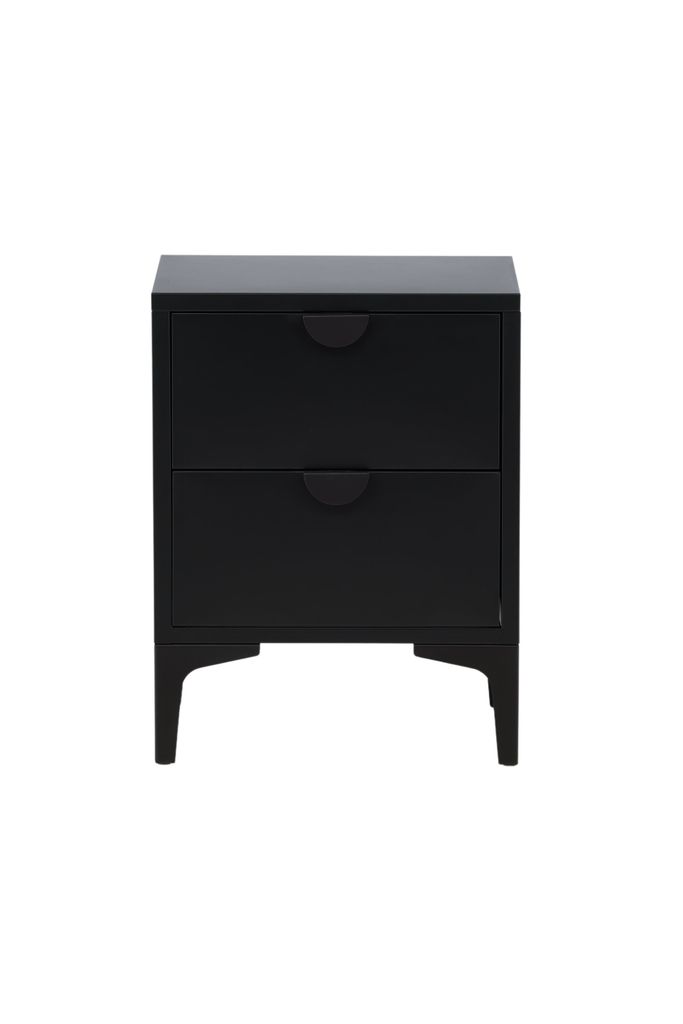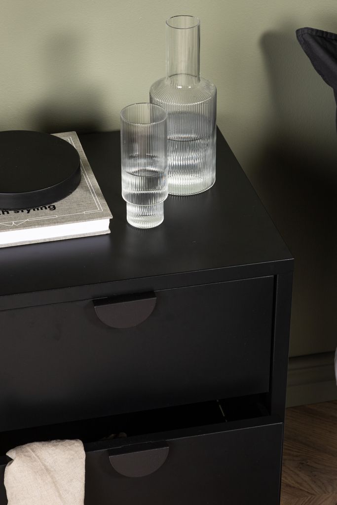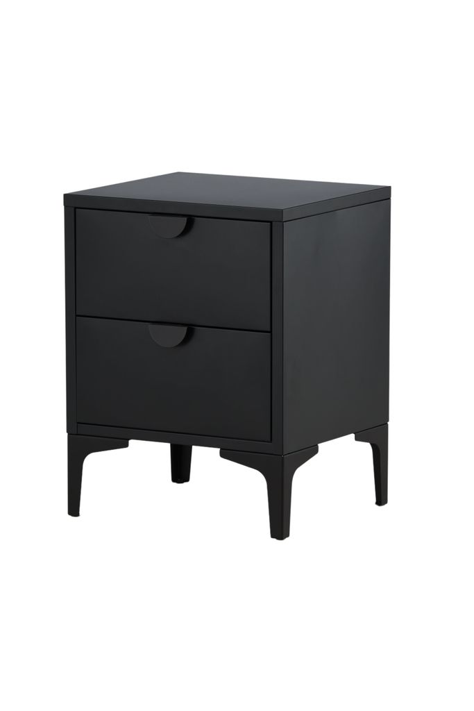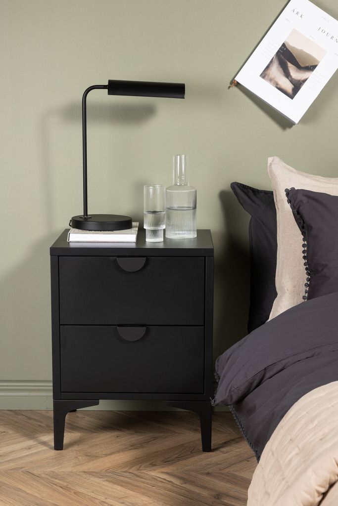 Elegant sängbord i svart stål med två lådor för dold förvaring. Perfekt för en modern och stilren sovrumsinredning.