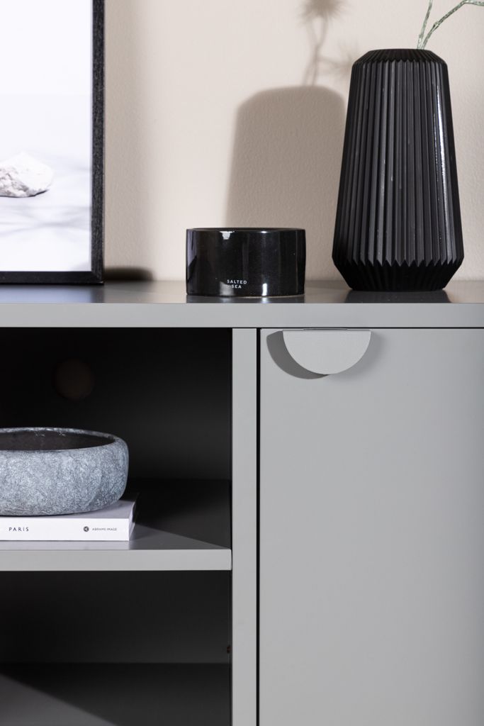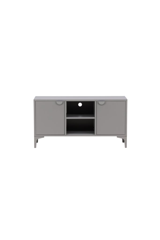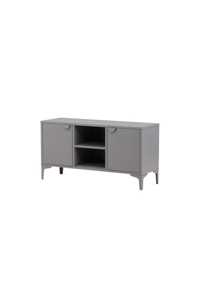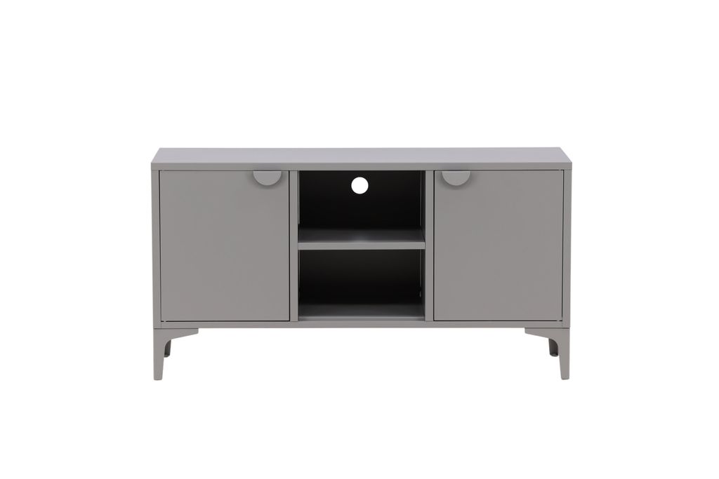 Modern tv-bänk i grått stål med praktisk förvaring. Två hyllplan med luckor och öppen mittdel för stilrena detaljer.