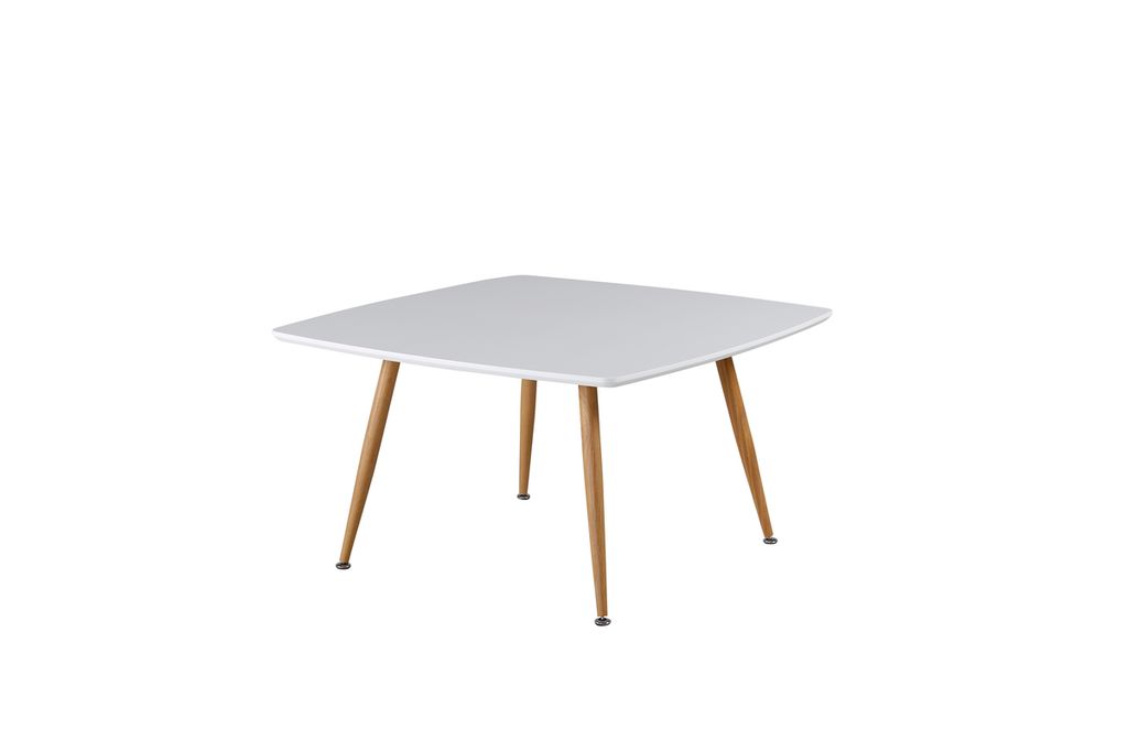 Tidlöst soffbord med vit MDF-skiva och träfärgade metallben. Enkel design som lyfter ditt hem.