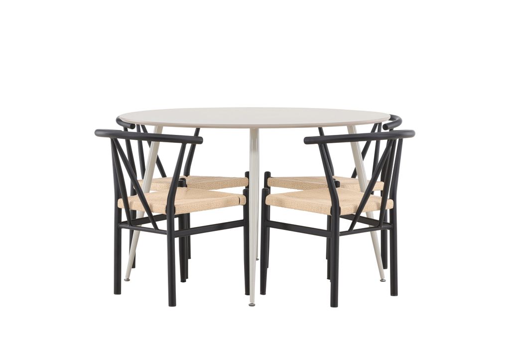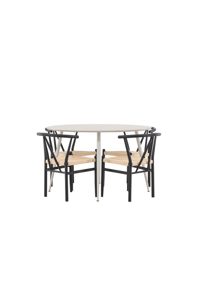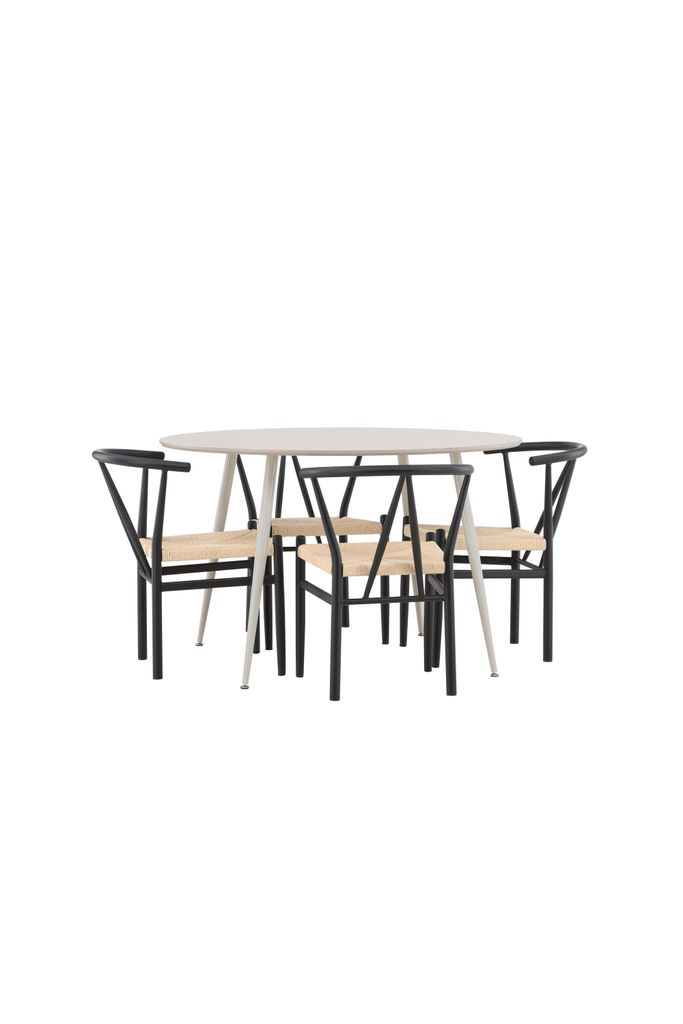De fyra Alfons-stolarna kompletterar bordet perfekt. Stolarna har eleganta beige sitsar i rotting och stilrena svarta metallben, vilket skapar både komfort och stil. Deras moderna design med naturliga material ger en sofistikerad och jordnära touch till ditt matrum.