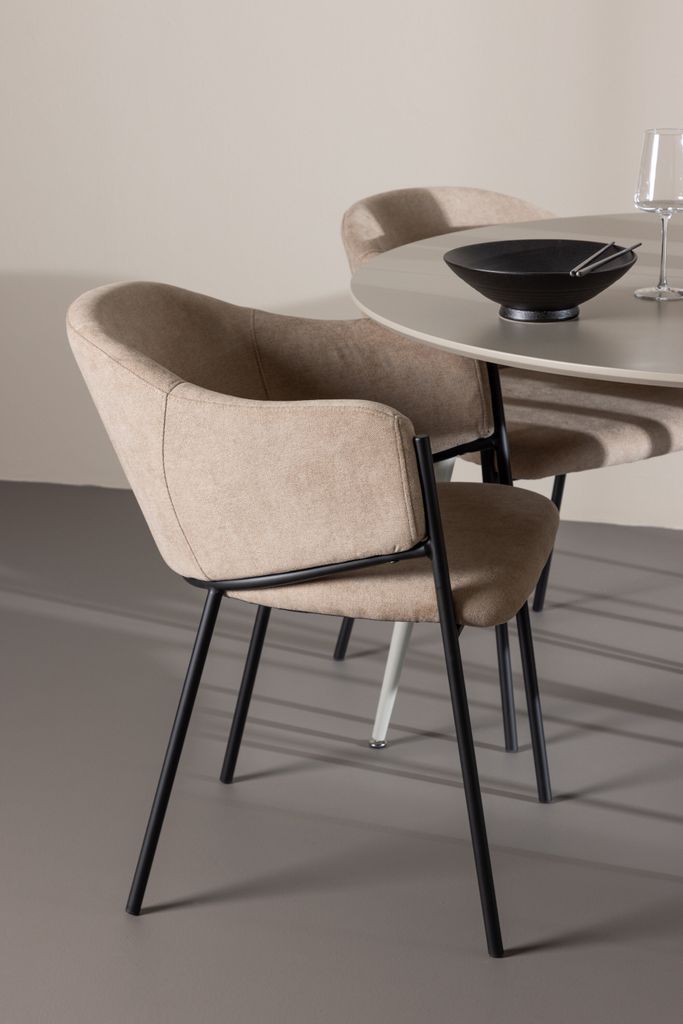 De fyra Evelina-stolarna kompletterar bordet perfekt med sina eleganta sitsar klädda i beige linne och stilrena svarta ben. Dessa stolar erbjuder både komfort och stil, vilket gör dem idealiska för långa, njutbara måltider med familj och vänner. Deras moderna design med hög ryggstöd och bekväma sitsar ger ditt matrum en sofistikerad och samtida touch.