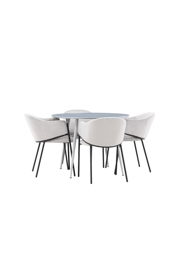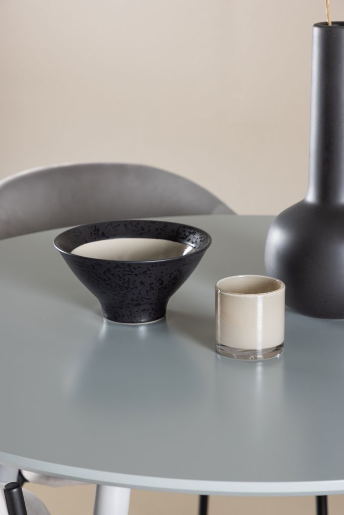 De fyra medföljande Evelina-stolarna kompletterar bordet på ett utmärkt sätt. Dessa stolar är klädda i mjuk grå sammet, vilket ger en lyxig och bekväm sittupplevelse. Sammetstyget är känt för sin elegans och mjukhet, vilket gör att du och dina gäster kan sitta bekvämt under långa middagar och samtal. Stolarna har svarta stålben som ger en stabil och hållbar konstruktion, samtidigt som de förstärker stolarnas moderna och eleganta utseende.