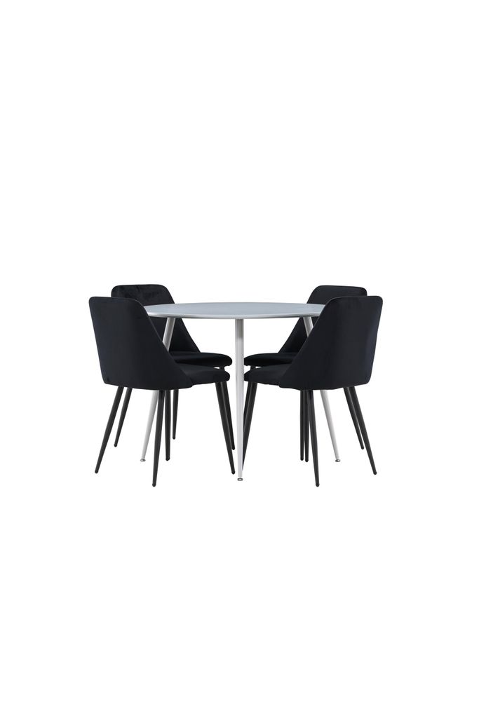 De fyra medföljande stolarna är klädda i lyxigt svart sammet, vilket ger en mjuk och inbjudande sittupplevelse. Den eleganta designen av stolarna kompletterar det grå bordet perfekt, och skapar en stilfull och modern atmosfär i ditt matrum.