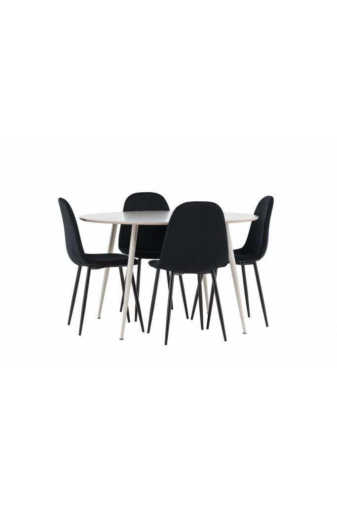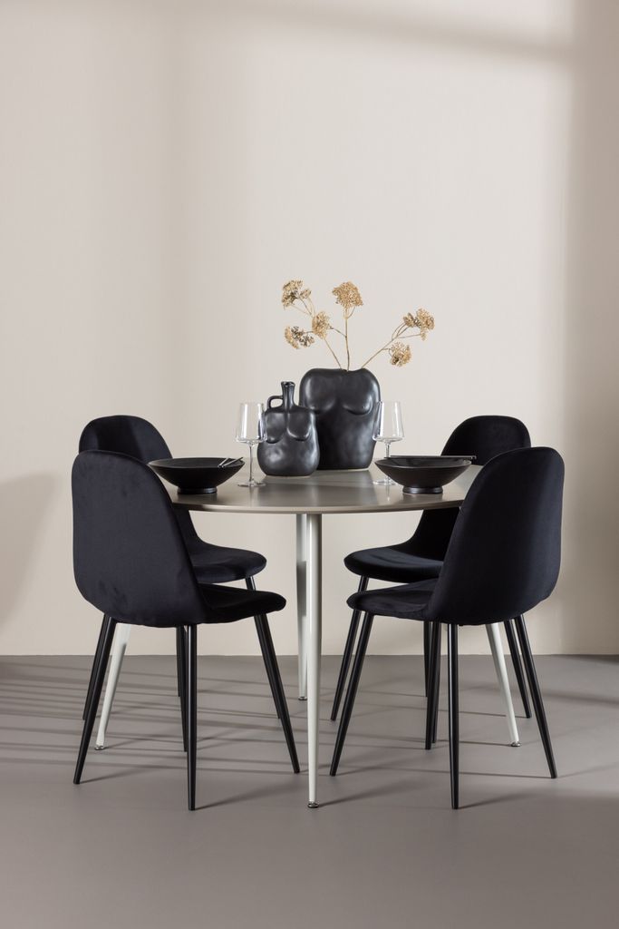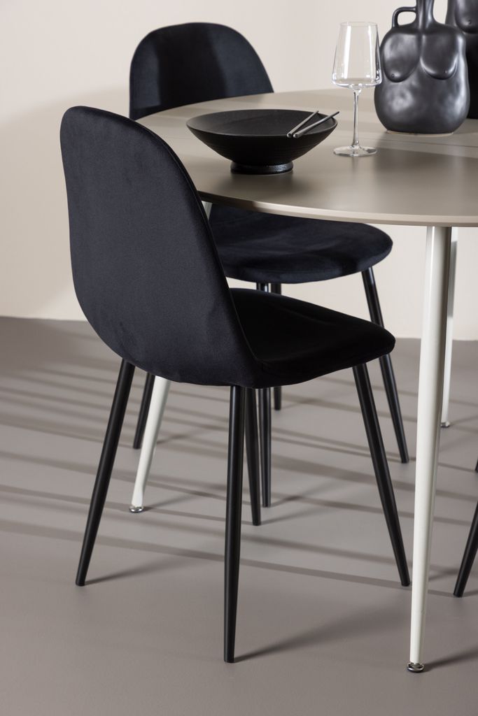 De fyra Polar-stolarna kompletterar bordet perfekt med sina eleganta sitsar klädda i svart sammet. Dessa stolar erbjuder både komfort och stil, vilket gör dem idealiska för långa, njutbara middagar med familj och vänner. Deras moderna design med hög ryggstöd och mjuka sitsar ger ditt matrum en sofistikerad och samtida touch.