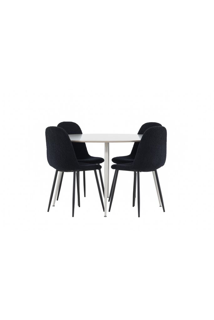 De fyra Polar-stolarna är klädda i mjuk och bekväm polyester teddy i en elegant svart färg. Dessa stolar erbjuder en kombination av komfort och stil, vilket gör dem idealiska för långa, njutbara måltider med familj och vänner. Deras moderna design med hög ryggstöd och lyxiga sitsar ger ditt matrum en sofistikerad och samtida touch. De konformade benen i svart och vit metall bidrar till en stilren och elegant estetik.