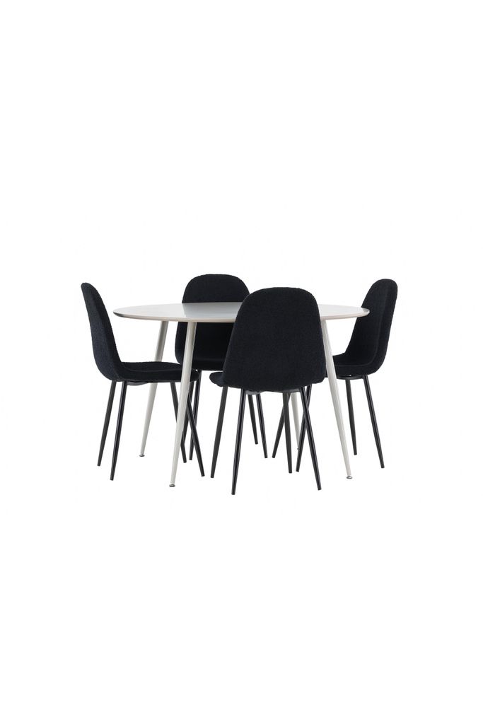 Elegant matgrupp med rund Plaza-bord i beige och bekväma Polar-stolar i svart teddy. Perfekt för stilfulla middagar.