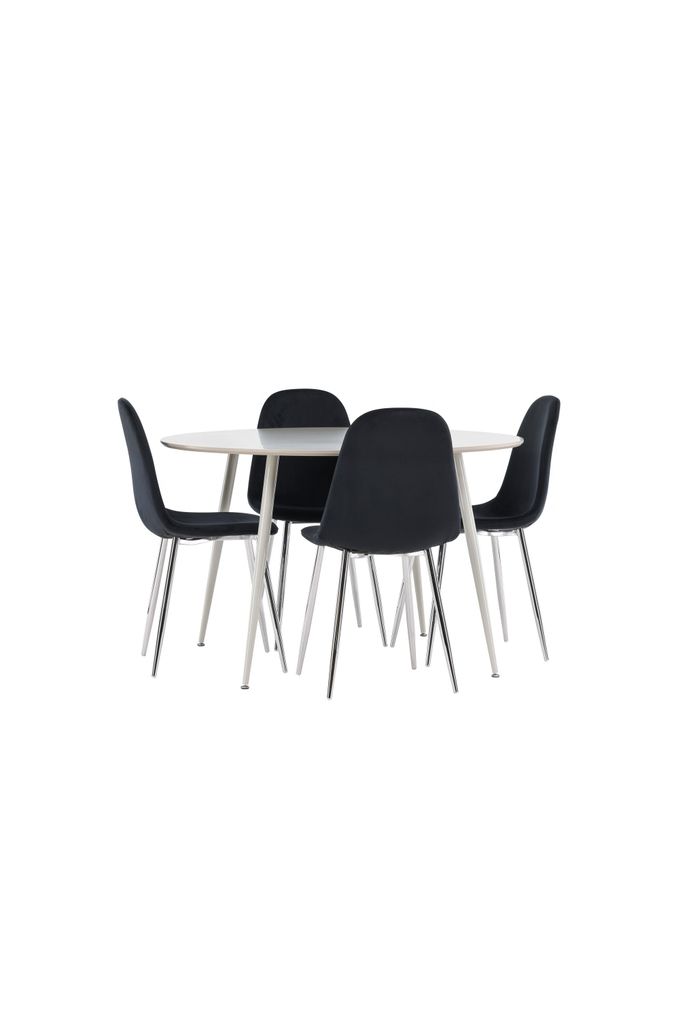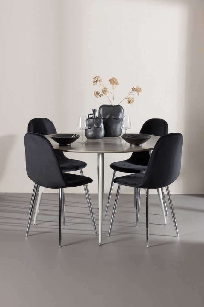 De fyra Polar-stolarna kompletterar bordet perfekt med sina eleganta sitsar klädda i svart sammet. Dessa stolar erbjuder både komfort och stil, vilket gör dem idealiska för långa, njutbara middagar med familj och vänner. Deras moderna design med hög ryggstöd och mjuka sitsar ger ditt matrum en sofistikerad och samtida touch.