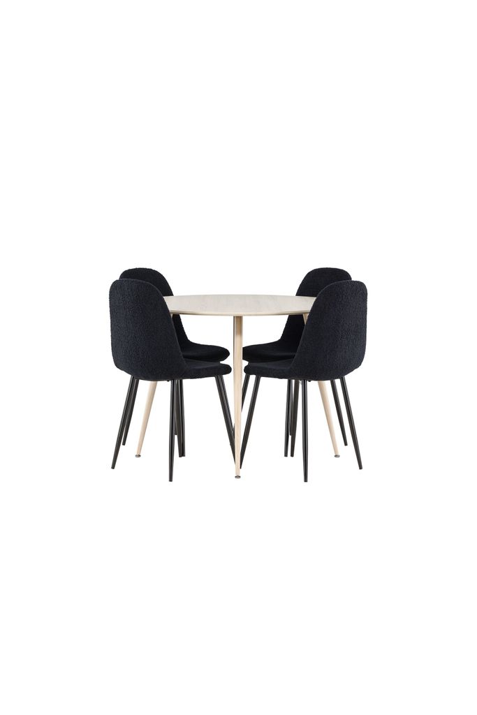 Polar matstolarna har en djup svart färg och är tillverkade av mjuk polyester teddy, vilket ger en exklusiv och bekväm sittupplevelse. De FSC®-certifierade stolbenen i svart stål ger både stabilitet och ett modernt utseende.
