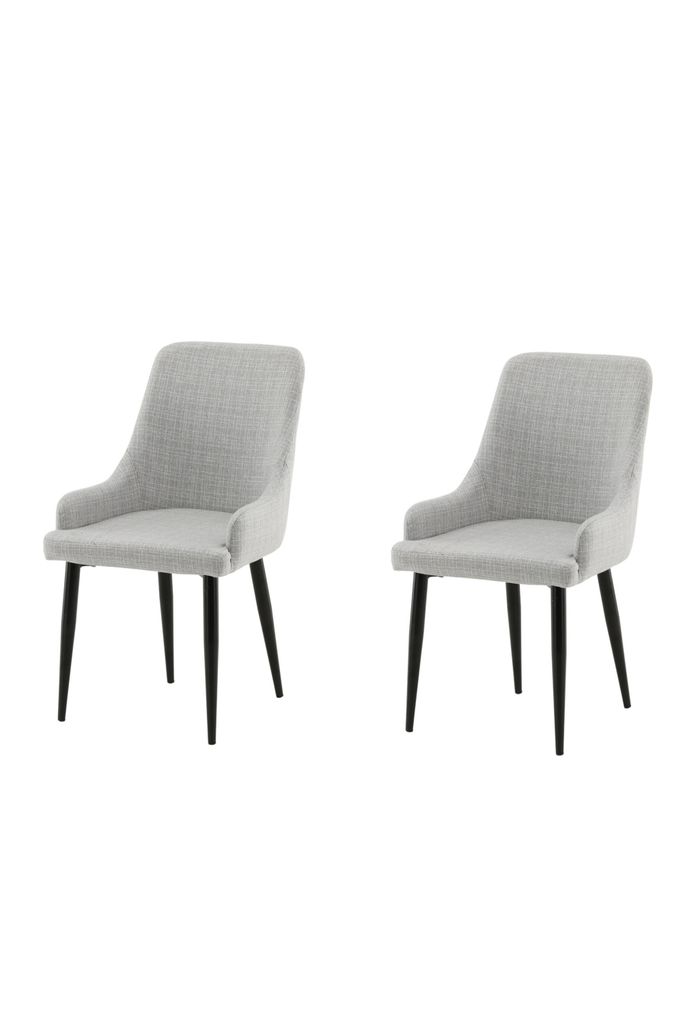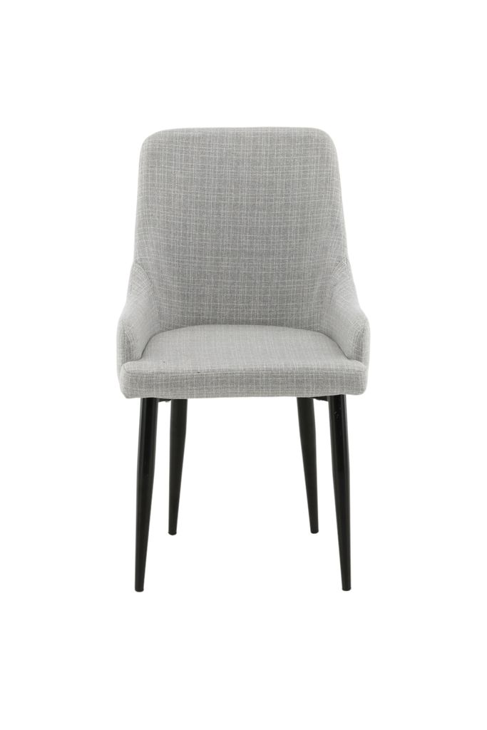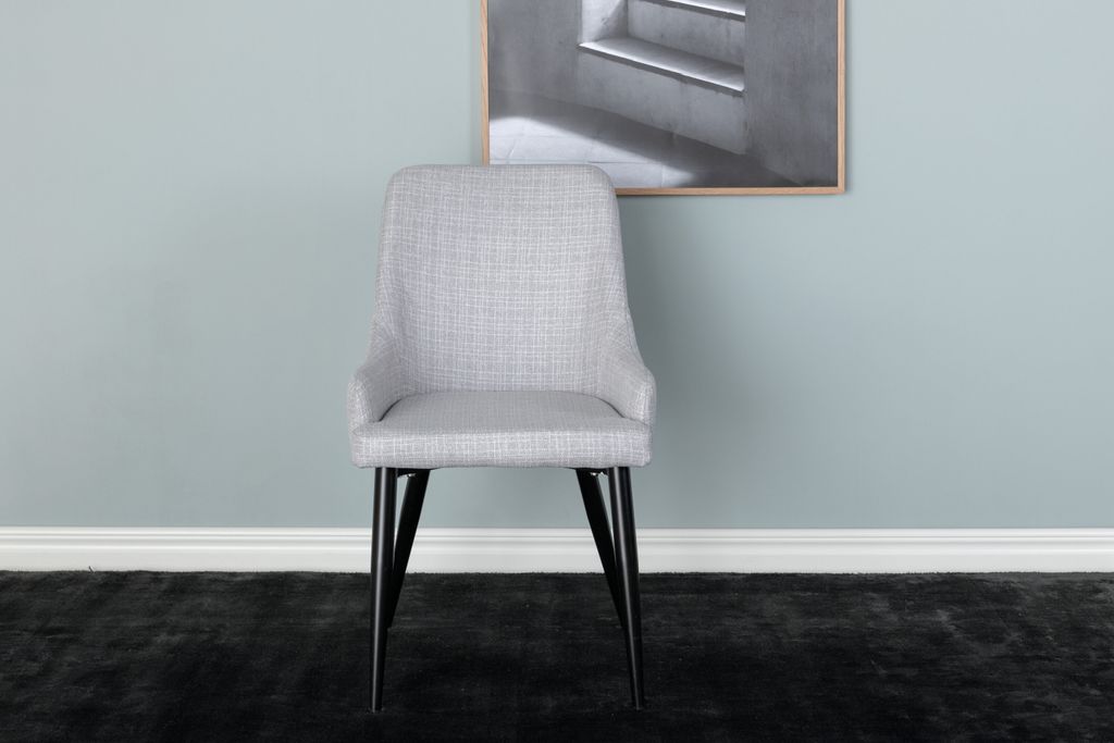 Elegant och bekväm matstol med ljusgrått polyestertyg och svart pulverlackerade metallben. Perfekt för moderna hem.
