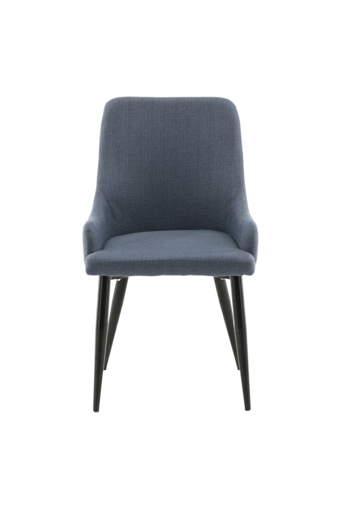 Elegant matstol med blått polyestertyg och svart metallben. Mjuk stoppning för komfort.