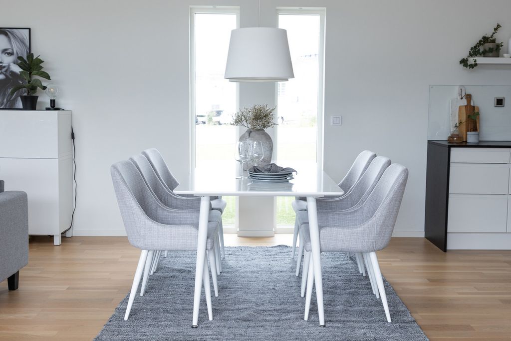 En ljus och inbjudande matgrupp i stilren design. Matbord Polar har ett klassiskt utförande med influenser från Skandinavien som står sig över tid. Bordsskivan är i vit MDF och bordsbenen är lätt utböjda i metall. Här i läcker kombination med stolar från serien Plaza. Den genomtänka moderna designen har en stomme i vit pulverlackerad metall och ryggen/sitsen är i ljusgrått polyestertyg med mjuk stoppning. Lika snygg för ögat som bekväm att sitta på!