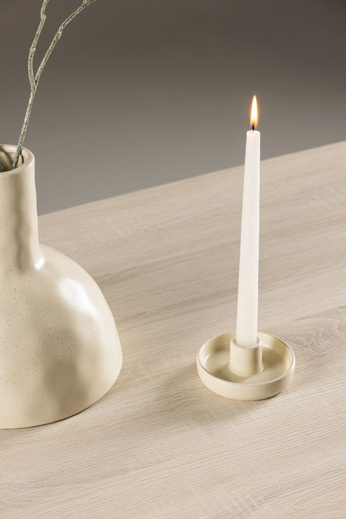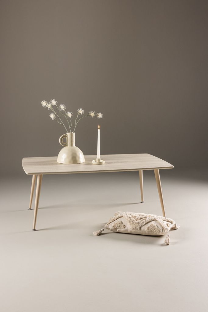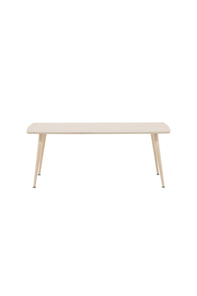 Bordets eleganta design kompletteras av de smala, avsmalnande stålfötterna som ger en lätt och luftig känsla samtidigt som de erbjuder stabilitet. Den jordnära färgtonen i vittvätt ger en varm och inbjudande atmosfär.