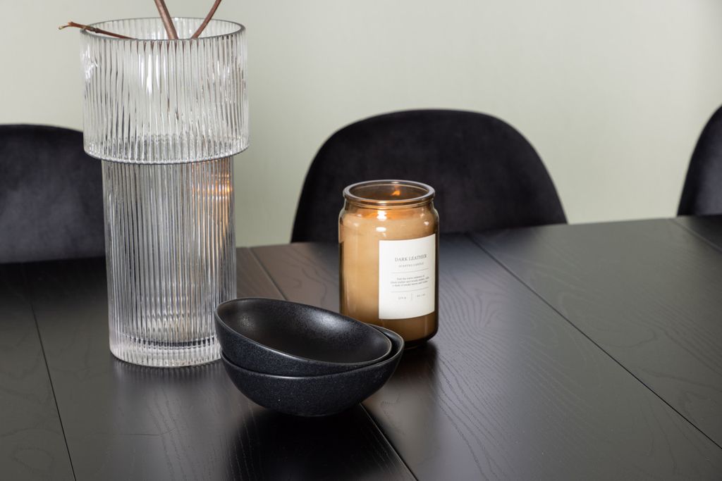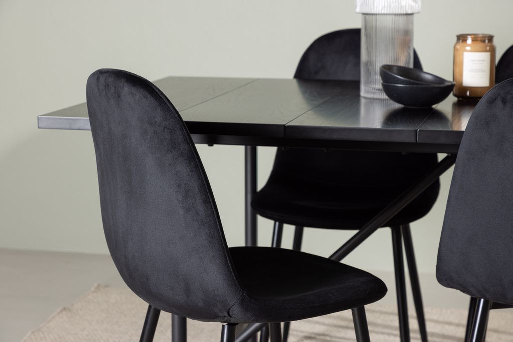 Till matbordet Astrid har vi matchat våra svarta matstolar från serien Polar som genast förhöjer elegansen. Den lätt rundade ryggen och den smäckra sitsen i mjukt svart sammetstyg med generös stoppning ger en underbar komfort. Stolsbenen är i matchade svart kulör och bidrar till det enhetliga blickfånget.
