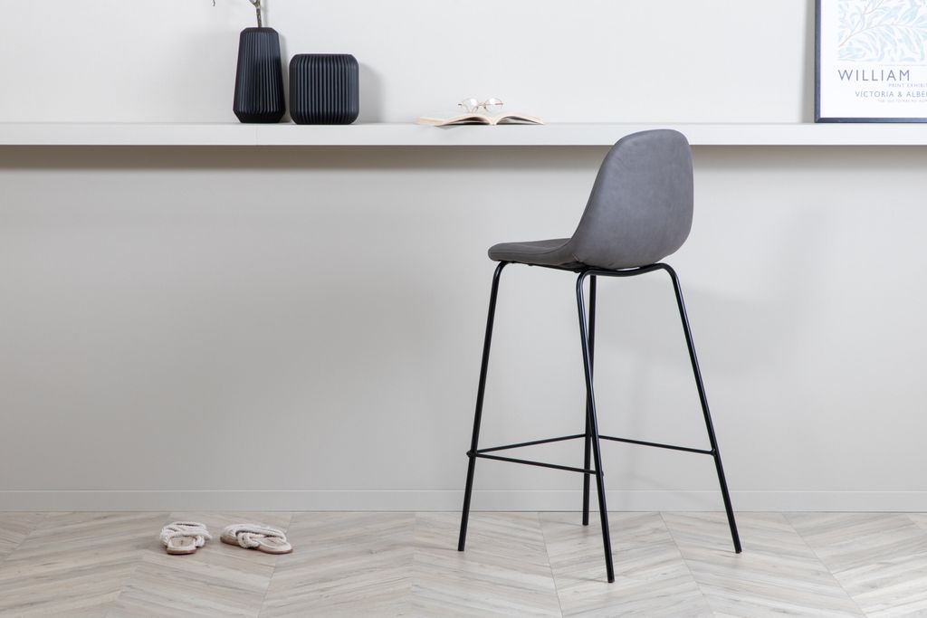 Skapa en lyxig atmosfär med Polar barstolar i grå mikrofiber och svart stål.