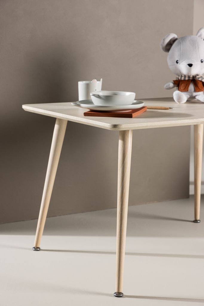 Polar barnmatbord är tillverkat av högkvalitativ MDF och stål, vilket ger det en robust struktur samtidigt som det behåller en lätt känsla. De eleganta benen ger bordet ett modernt utseende och metallen i benen är diskret men hållbar, vilket ger stabilitet.