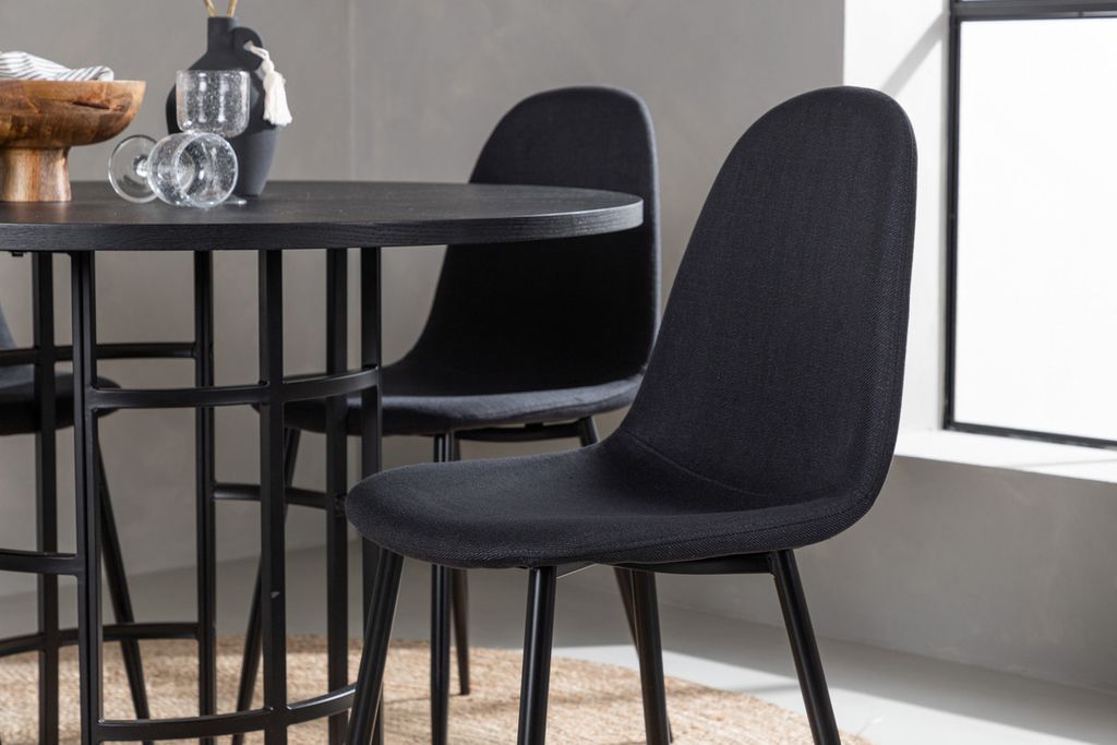 Stilrent, modernt och tidlöst - en matgrupp som imponerar! Detta trendsäkra matbord från serien Copenhagen tillhör Furniture Fashion kollektionen och har en sotig svart bordsskiva i MDF med fanér och ett dekorativt, cylinderformat underrede i svart metall. Här tillsammans med våra bekväma matstolar från serien Polar. Stolen har en helklädd design med en rundad rygg och sits i svart polyestertyg med mjuk stoppning och ben i svart pulverlackerad metall. Slipp kompromissa mellan komfort och design!