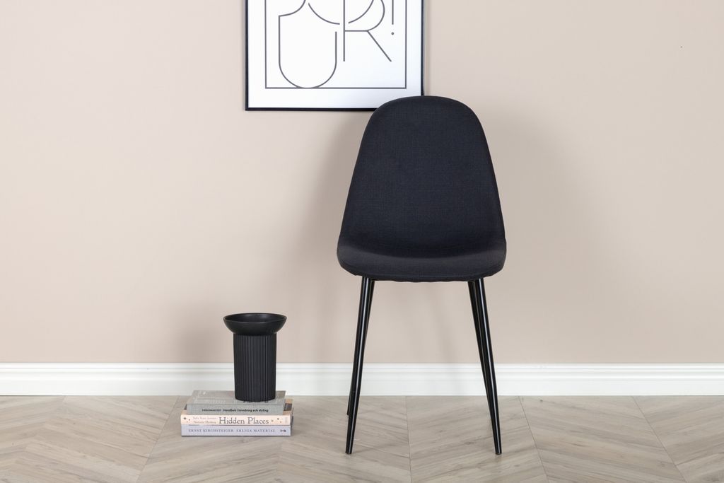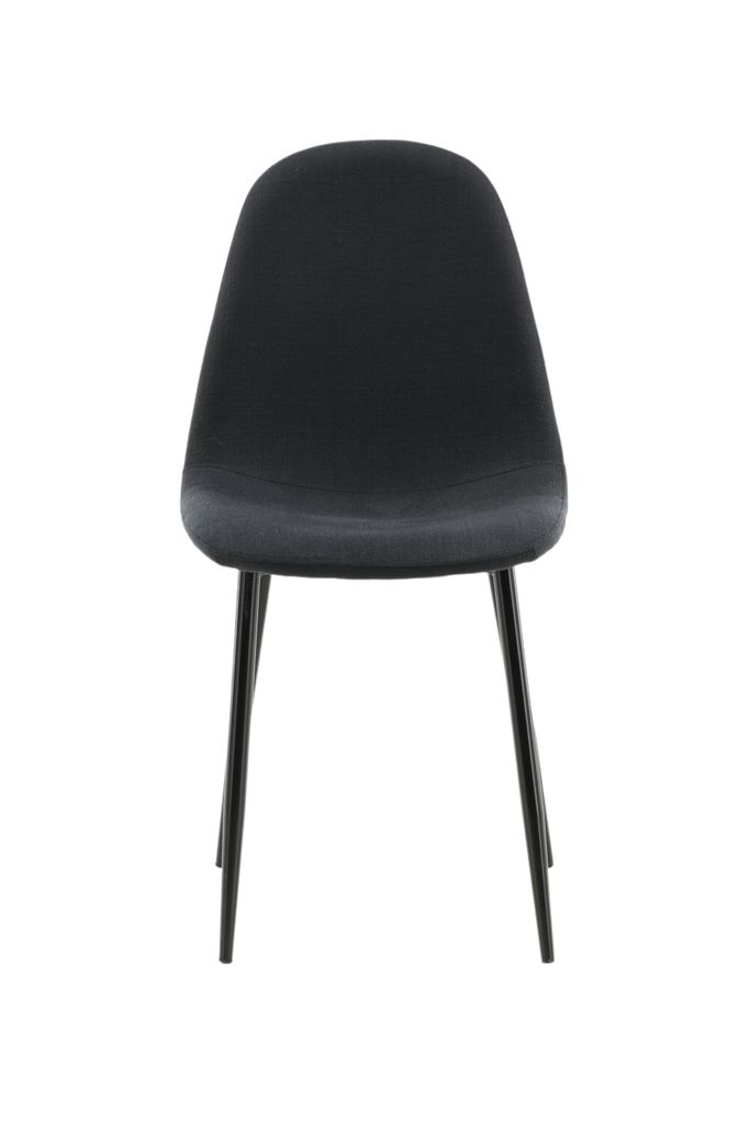 Elegant och tidlös matstol med rundad design, klädd i svart polyester med pulverlackerade metallben. Perfekt för moderna hem.