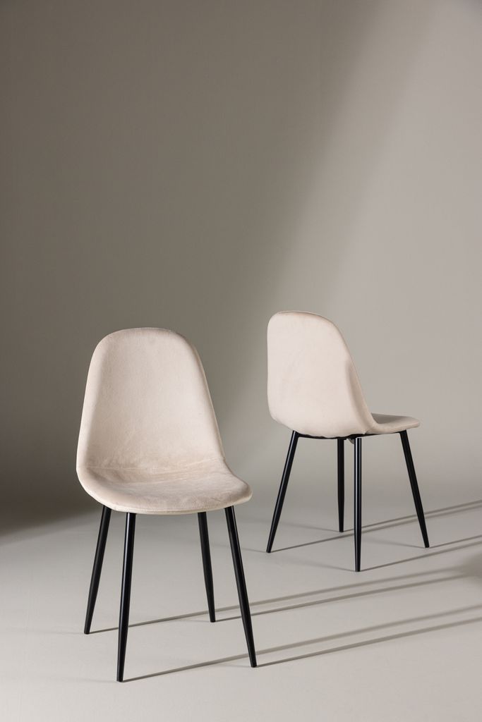 Stolens ben är gjorda av svart pulverlackerad metall, vilket ger en stabil och hållbar konstruktion samt en stilren kontrast till den beige sammeten. Designen är både iögonfallande och funktionell, perfekt för att skapa en inbjudande atmosfär i ditt hem.