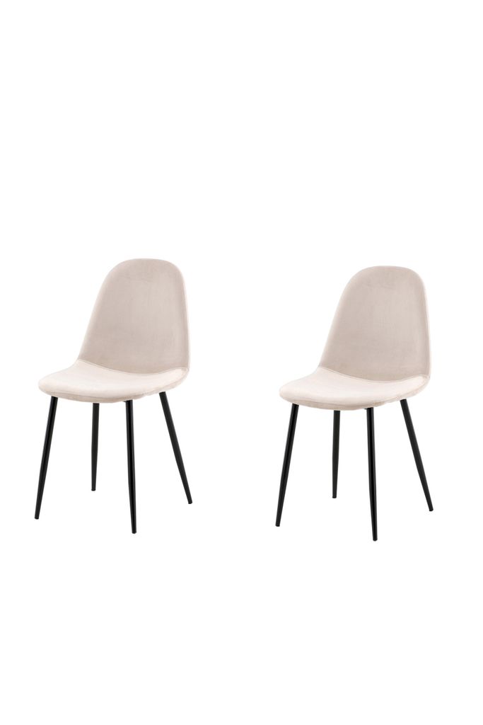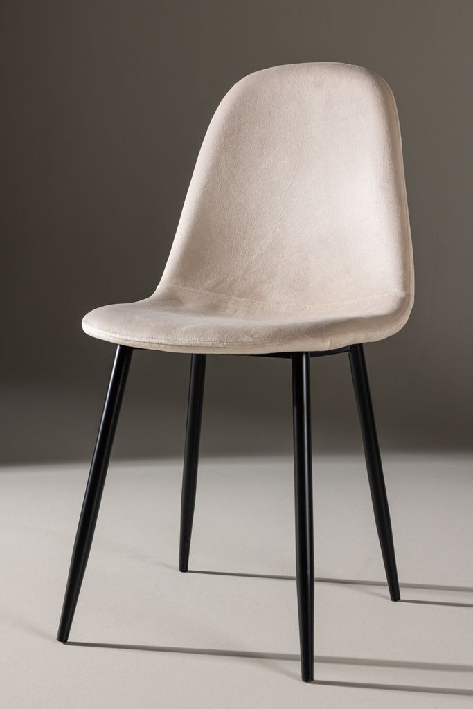 Modern matstol i beige sammet med svart metallben. Bekväm och stilren design för trivsamma måltider.