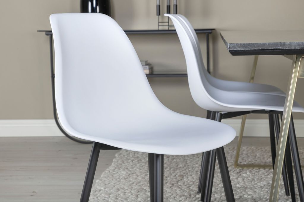 Elegant matstol i vit plast med svart metallben. Enkel att rengöra och perfekt för moderna hem.
