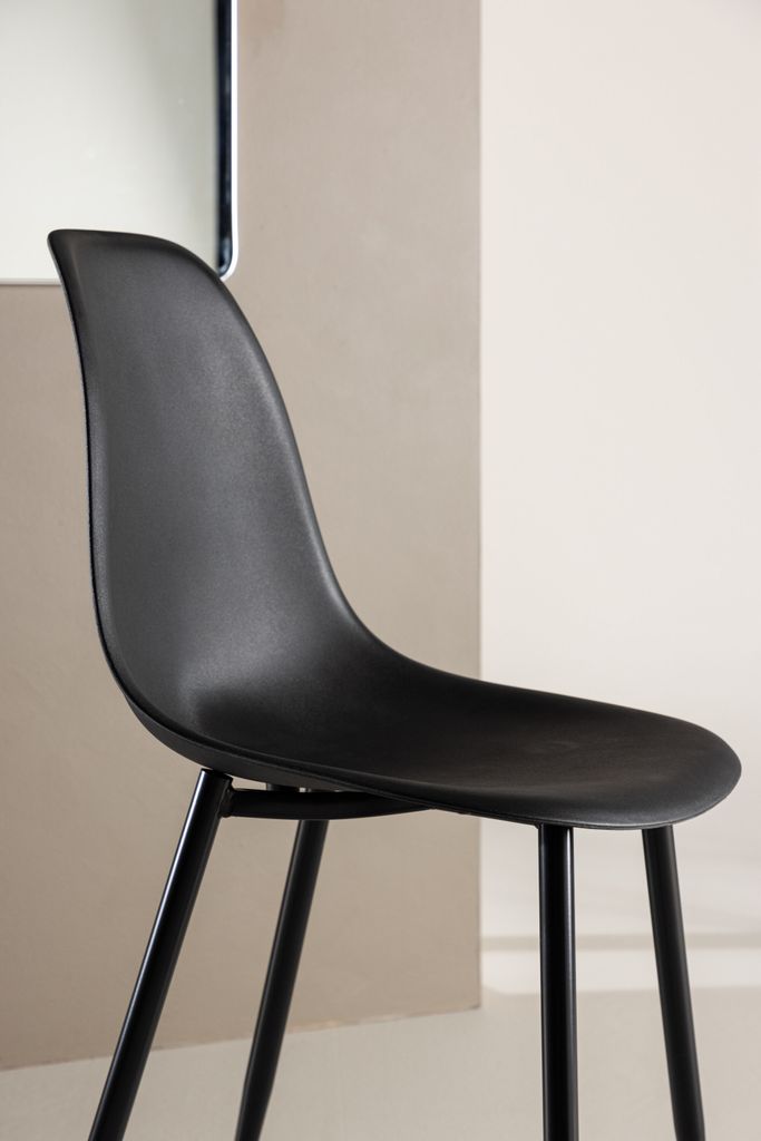 Elegant och praktisk matstol i svart helgjuten plast med metallben. Enkel att rengöra och stilren design.