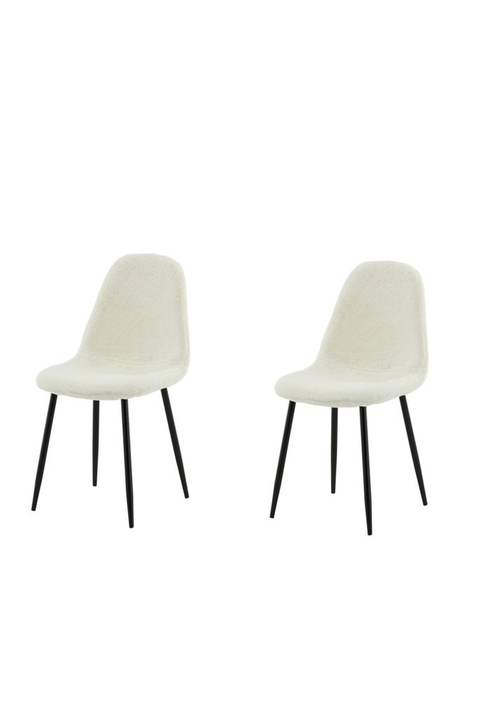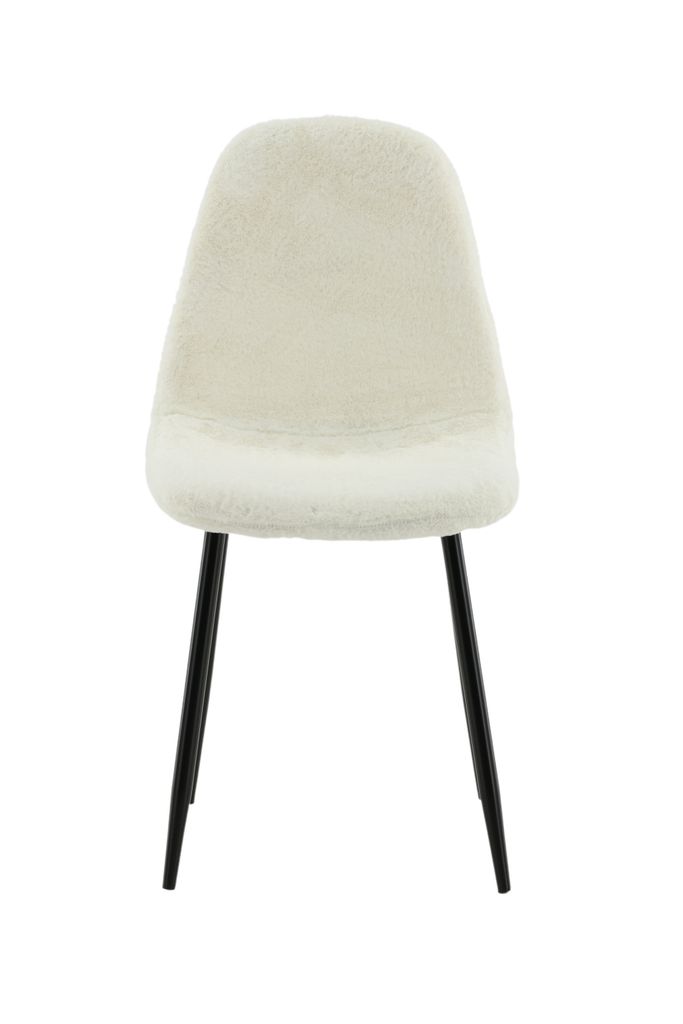 Elegant matstol i fluffigt vitt teddytyg med rundad rygg och svart metallben. Perfekt för stilfulla matrum.