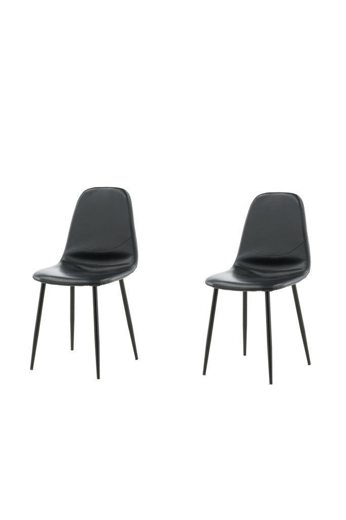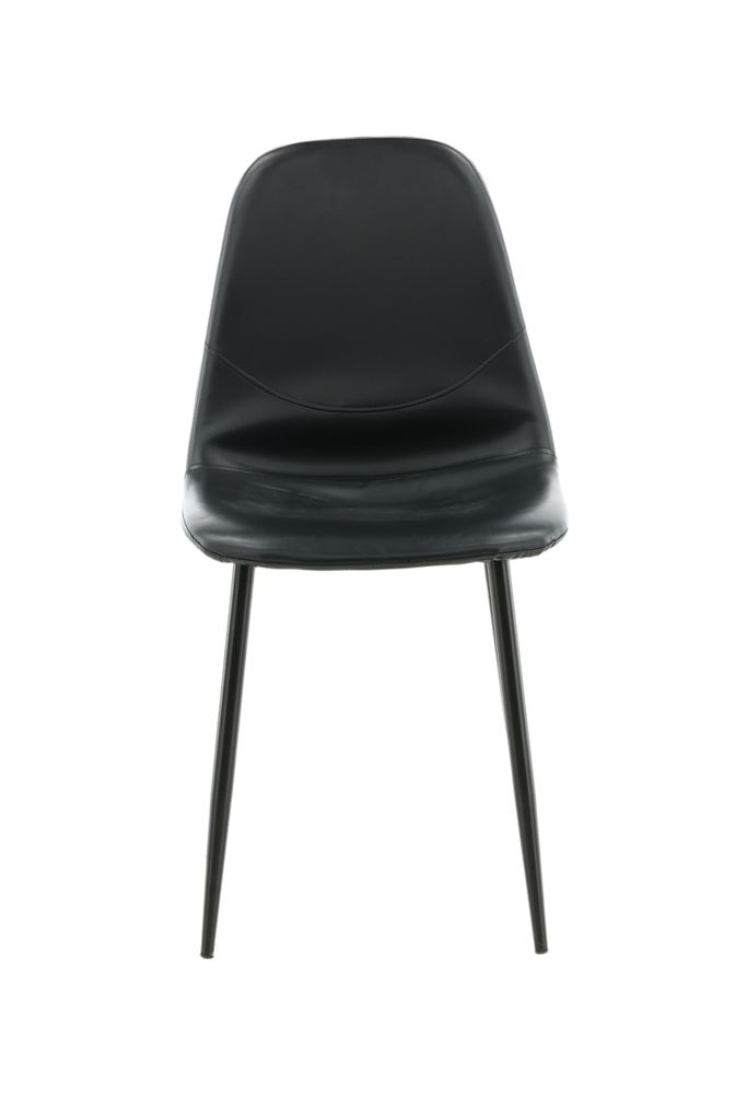 Elegant matstol i svart konstläder med mjuk stoppning och pulverlackerade metallben, perfekt för stilfulla måltider.