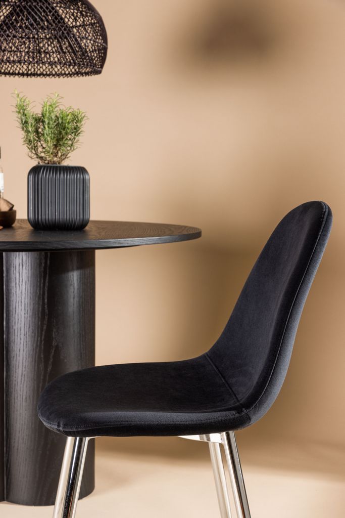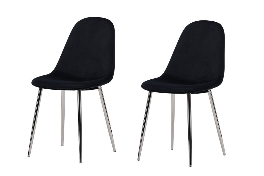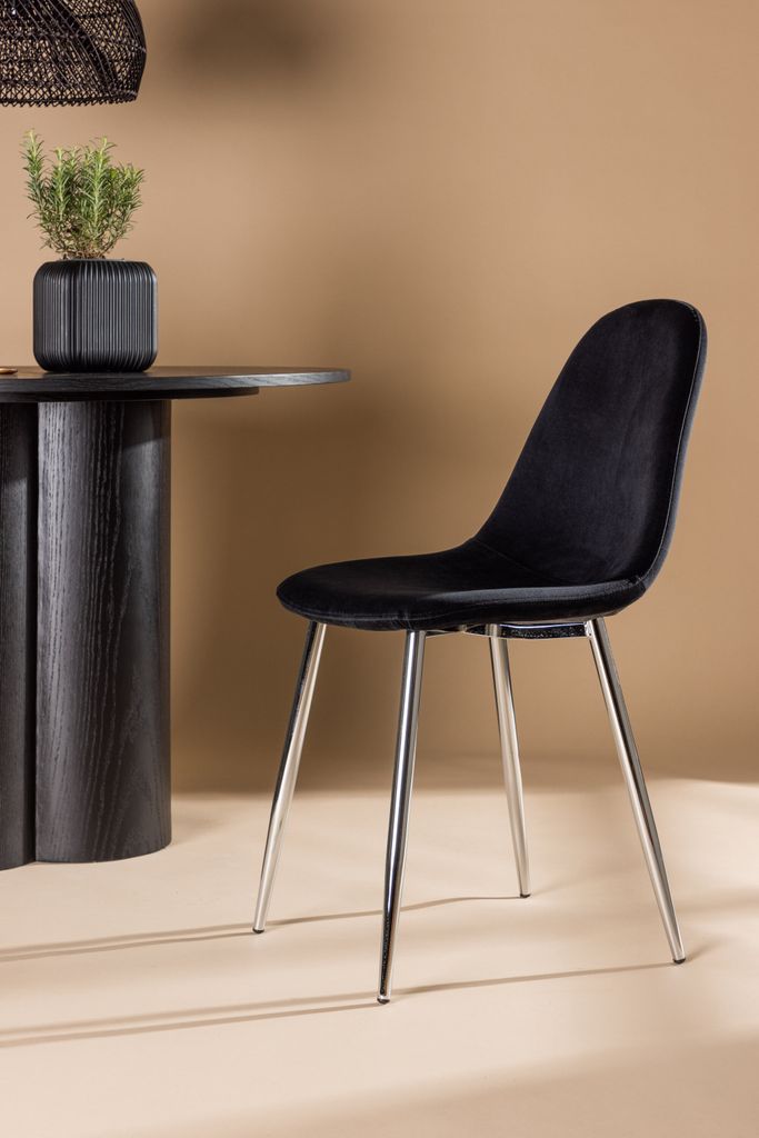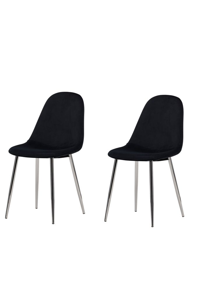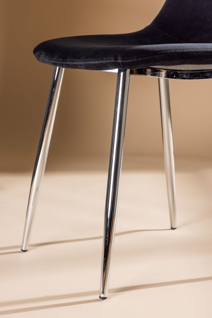 Elegant matstol i svart sammet med kromade ben. Perfekt kombination av komfort och stil för ditt hem.