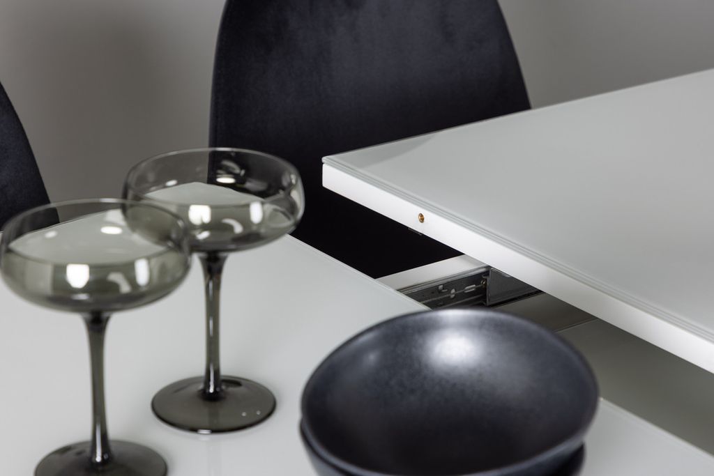 Vårt rektangulära matbord Pluto anpassar sig efter dina behov med en förlängningsbar bordsskiva i vit MDF med en snygg glasskiva ovanpå. i Bordets robusta och centralt placerade stomme ger dig också ett stabilt matbord som du kan lita på. Bordets mått: 120/160x90cm.