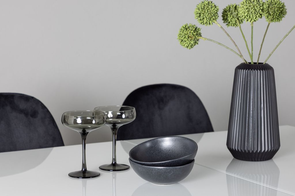 Med sin helklädda design och ben i svart pulverlackerad metall, kombinerar matstolarna stil med komfort. Den rundade ryggen och sitts i svart sammetstyg med mjuk stoppning ger en lyxig känsla och gör att du kan sitta bekvämt under långa måltider eller sällskapliga stunder. Vad mer kan man önska? Här får du allt du behöver till en mysig och smart matgrupp!