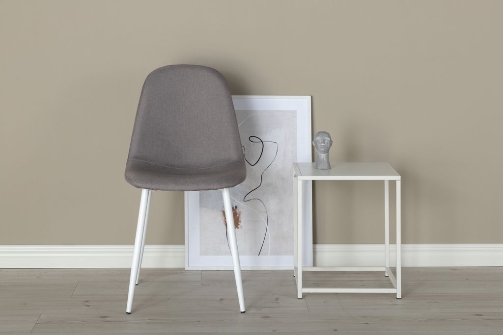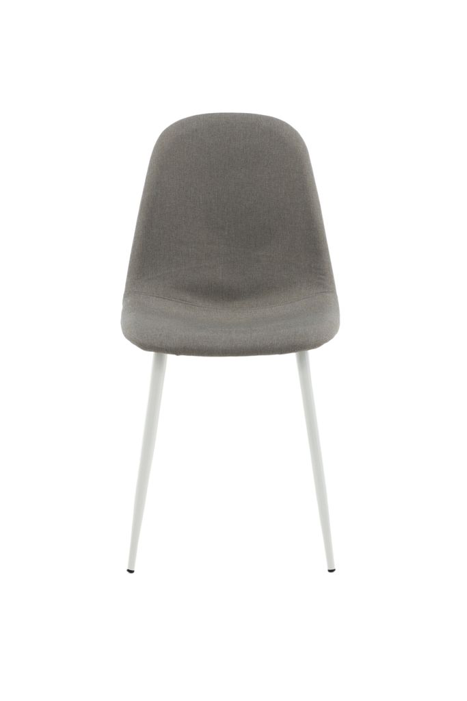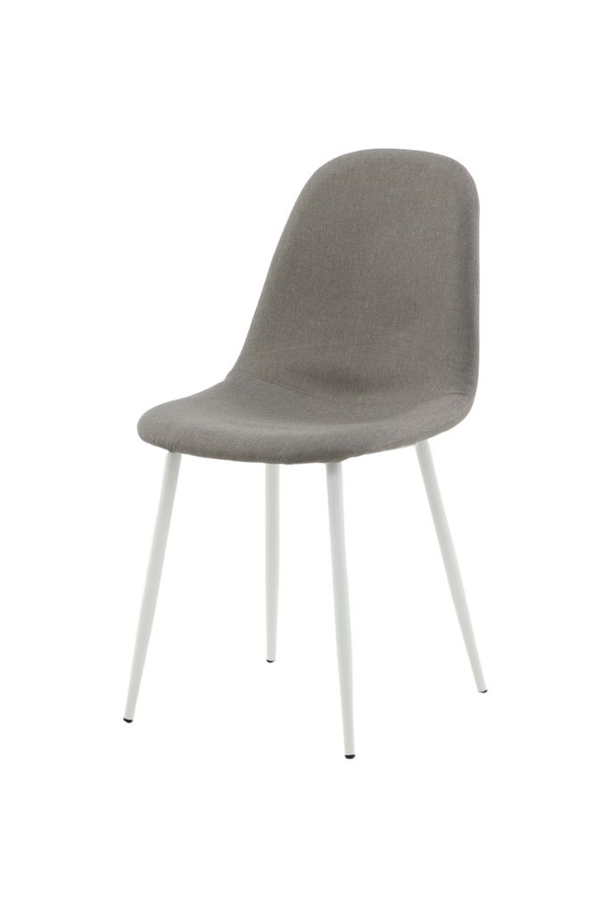 Elegant och bekväm matstol med grått polyestertyg och vita metallben. Perfekt för moderna hem.