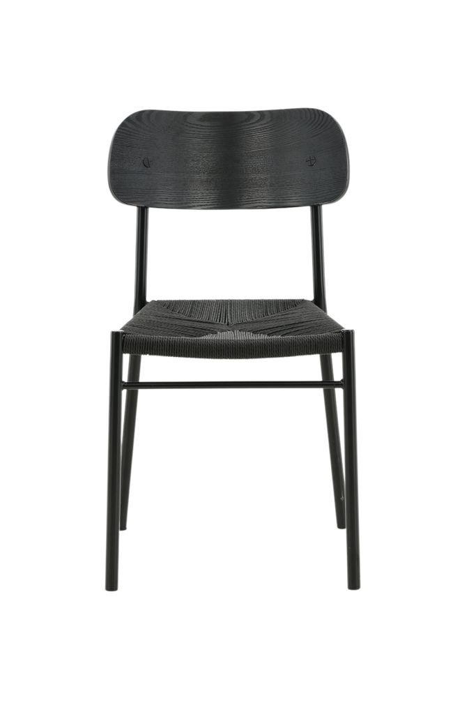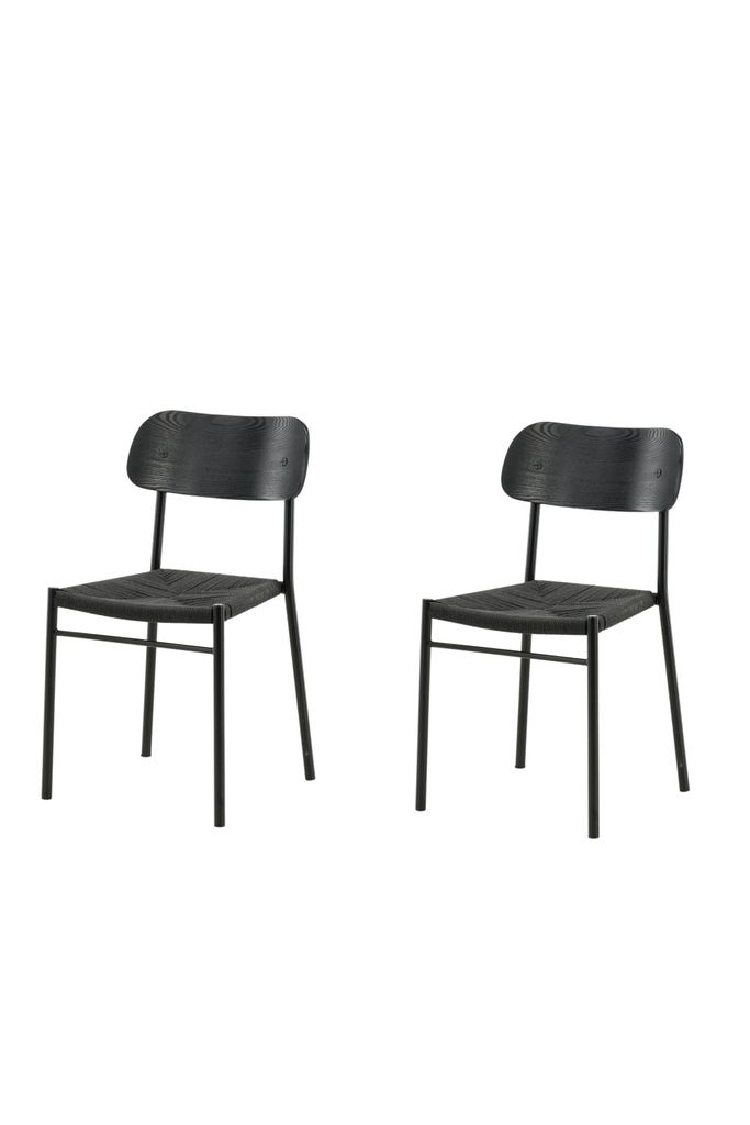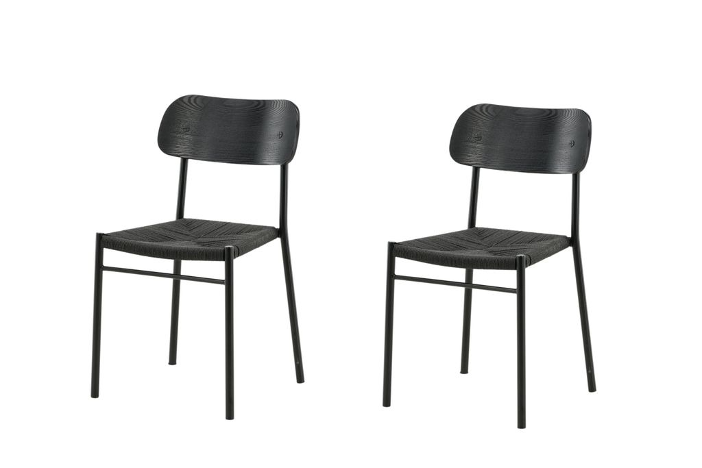 Minimalistiska stolar i svart med MDF-rygg och naturfiberväv, perfekt för stilrena måltider.