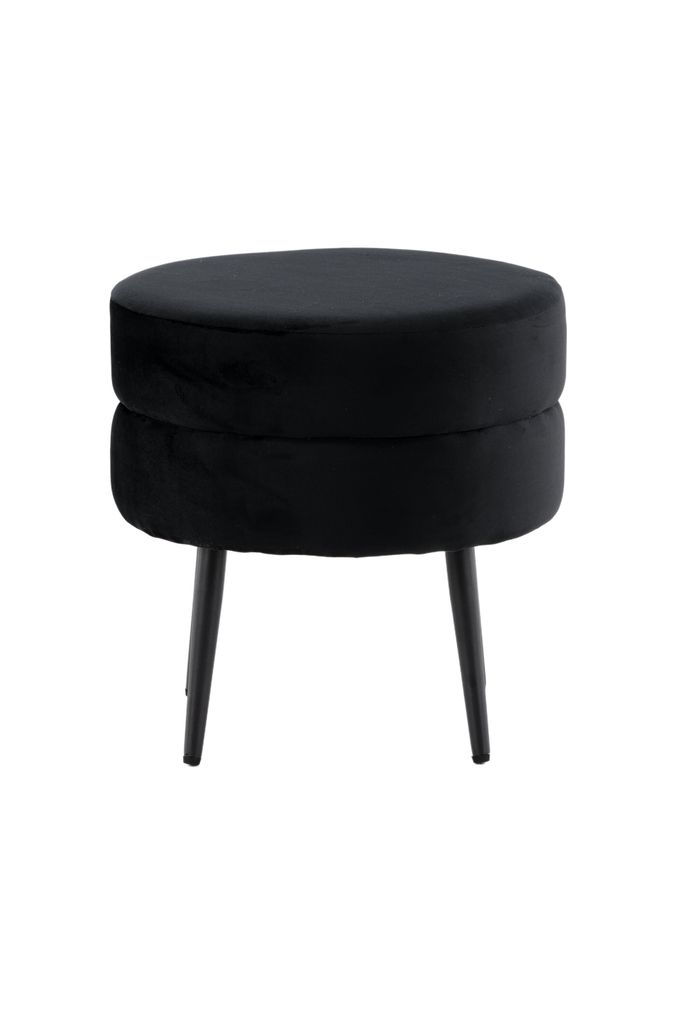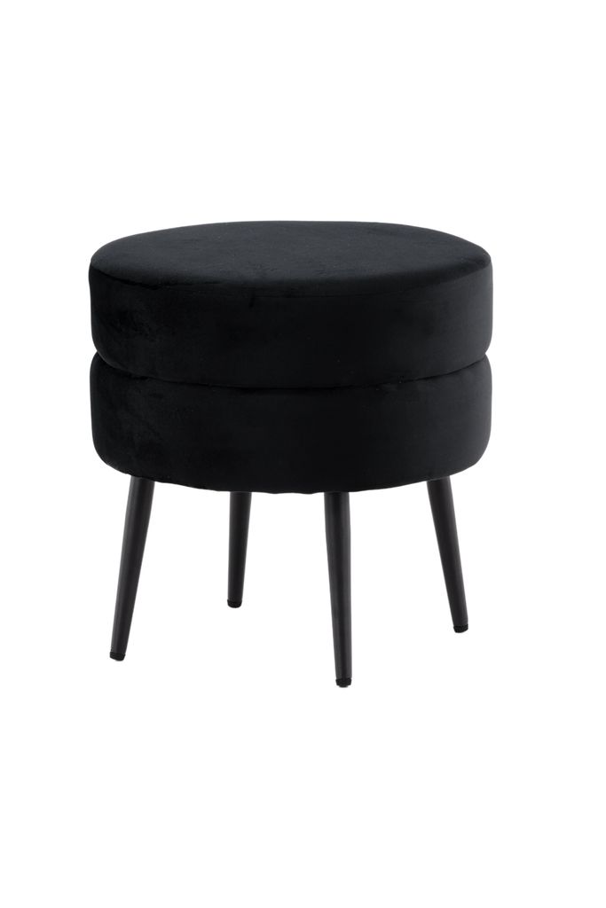 Elegant sittpuff i svart sammet med lätt utsvängda stålben. Perfekt som fotpall eller dekorativ detalj.